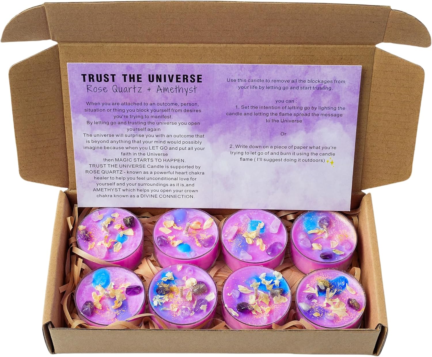 • Tea Lights set of 8 candles: rose + quartz + amethyst. Believe in the Universe Candles are supported by Rose Quartz - known as a powerful heart chakra healer that can help you feel unconditional love for yourself and your surroundings, and Amethyst that can help you open the top chakra known as the Divine Connection.