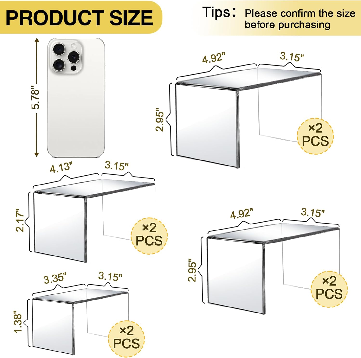 • Warm Tips: Before purchasing, please make sure the size meets your needs for placing items. Note: These sizes of display stands are suitable for displaying smaller items. The acrylic display risers have one layers of thin protective film on the inside and outside, which must be removed before use