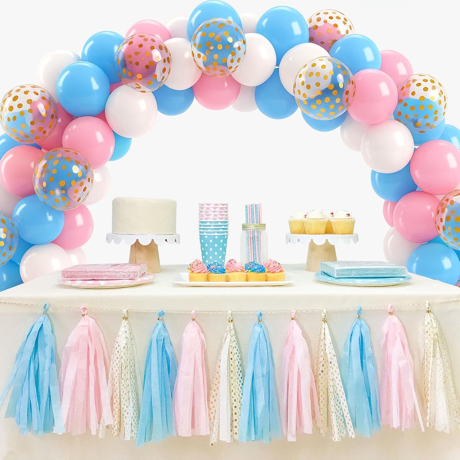 • Package Include: Our pink and blue balloons kit includes 15 pcs pastel blue balloons, 15 pcs macaron pink balloons, 10 pcs white balloons, 10 pcs gold confetti balloons, 1 pink ribbon and 1 blue ribbon