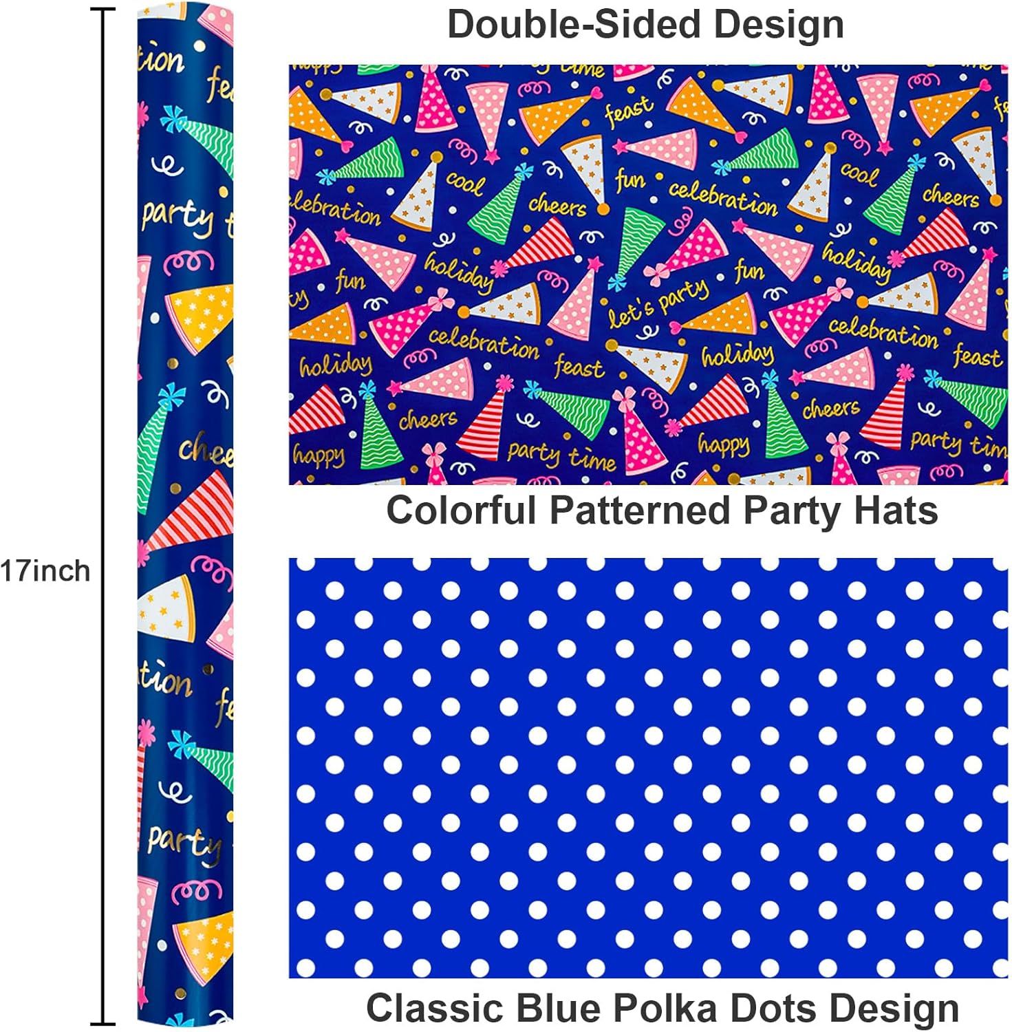 • Kid Festive Wrapping Paper: Bright and cheerful party hat patterns with phrases like "celebration" and "fun" on a rich navy blue background, elegant blue polka dot design on reverse, adding a festive touch to any gift.