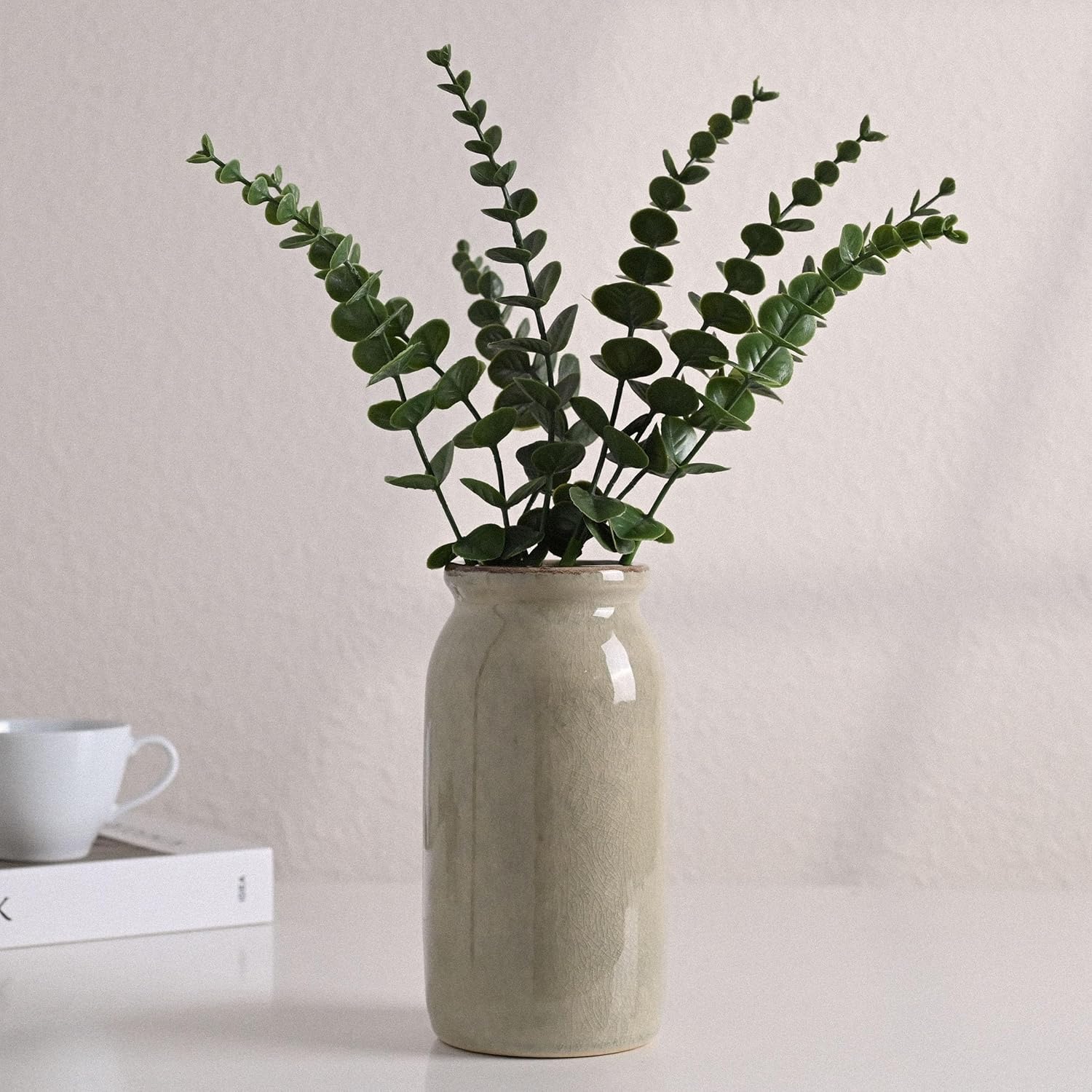VICTOR & TERESA Rustic Green Vase for Home Decor, Ceramic Vases for Flowers, Modern Farmhouse Decorative Vases for Pampas Grass,Table Accent, Mantel, Living Room,Bookshelf, Centerpieces, 8''