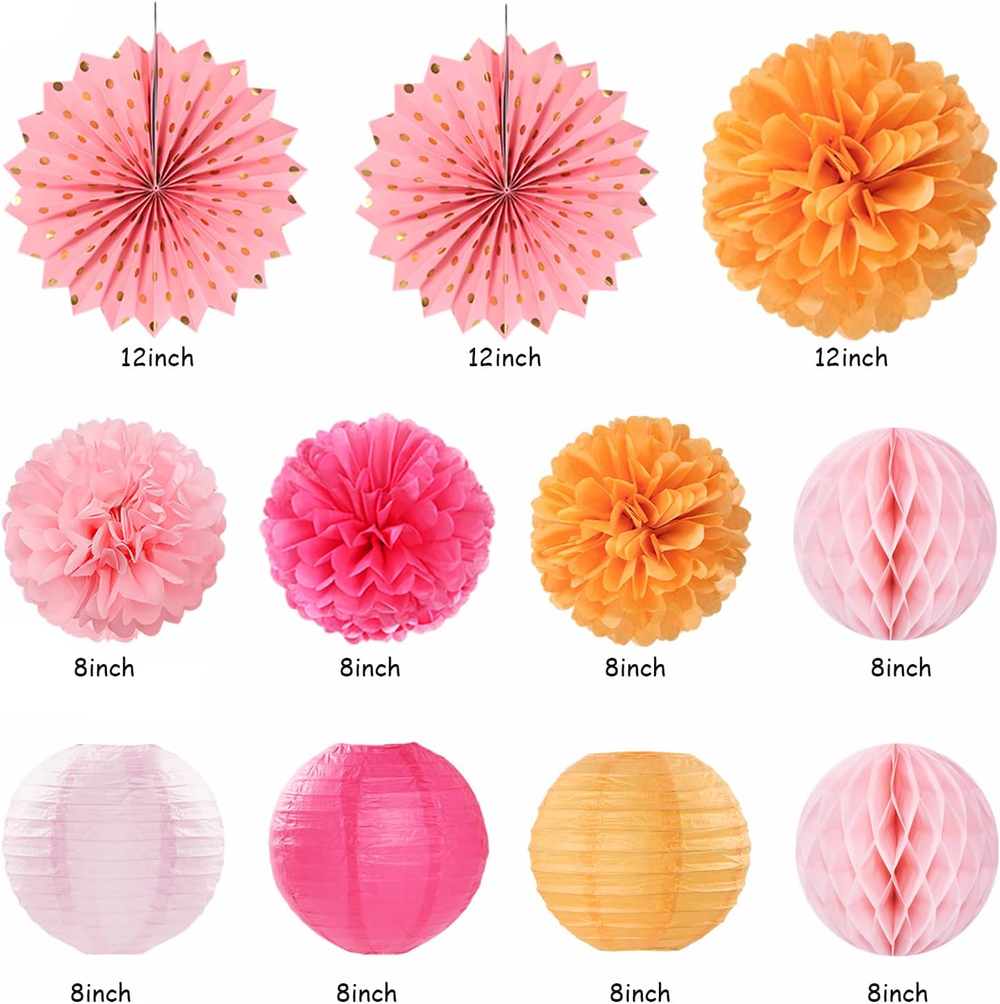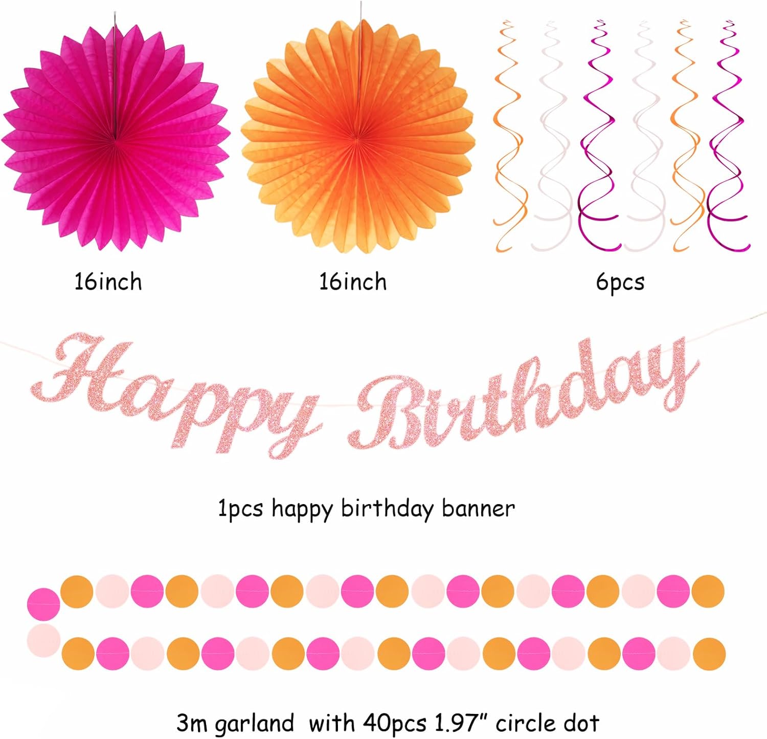 • 【Hot Pink Orange Fall Birthday kits】This kits include 1pcs happy birthday banner, 1pcs circle dots paper banner, 4pcs tissue pom poms: 3pcs 10" and 1pcs 12" , 3pcs 8inch paper honeycom ball, 2pcs 8inch paper lantern, 4pcs 12inch paper flower fan, 6pcs Paper swirls hanging streamers