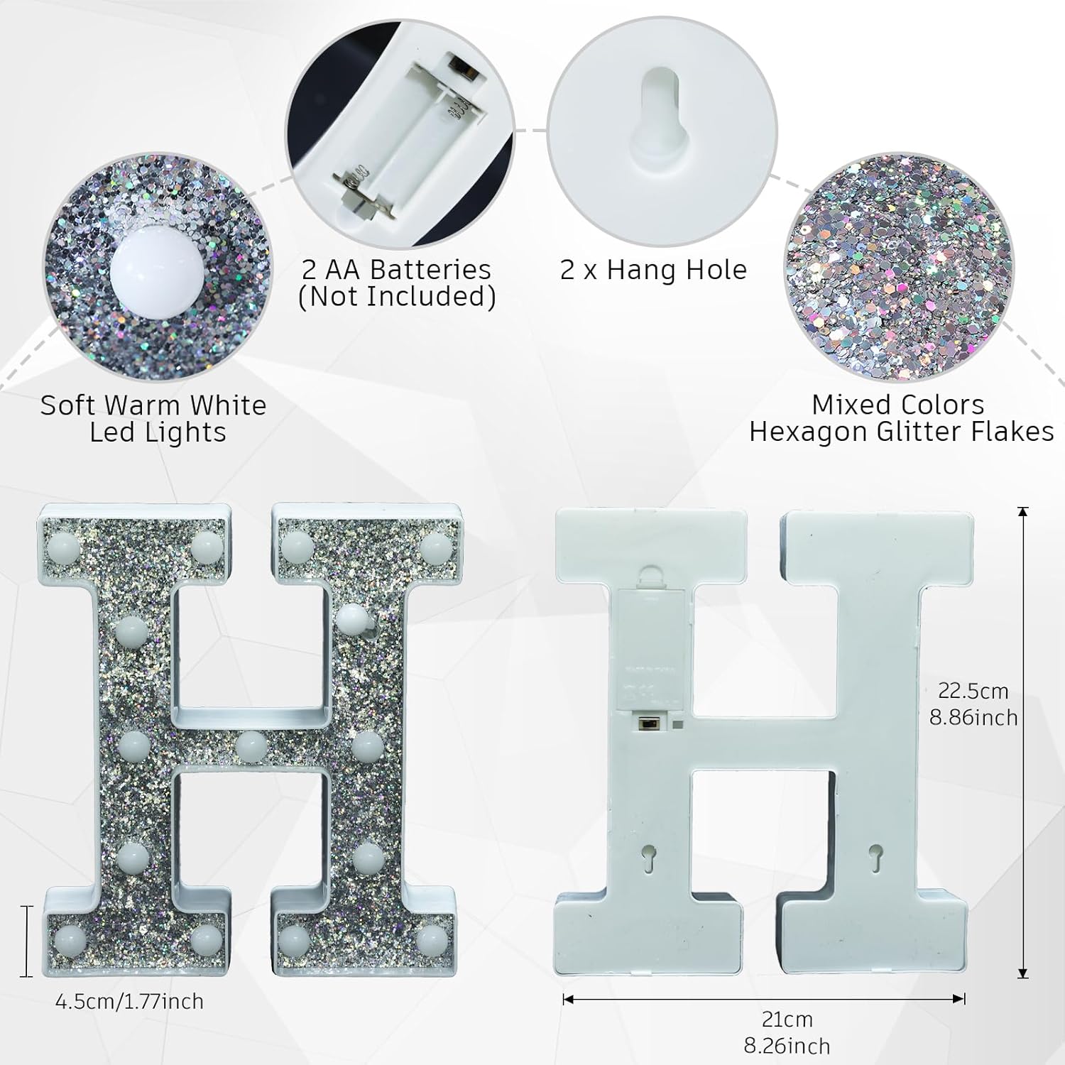 • ๐Ÿ’ก Elegant Glitter Light-Up Letters with Silver Diamond Finish: These LED marquee light up letters feature a stunning glitter effect combined with a sophisticated silver diamond surface. Including all 26 alphabet letters and 10 numbers, these light up letters bring sparkle and elegance to any space, making them the perfect light letters for party decor, especially as light up letters for table settings or wall accents.