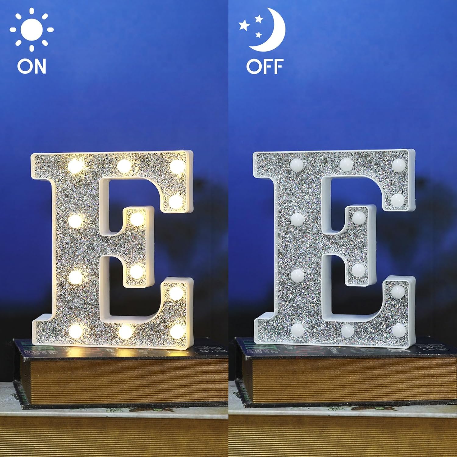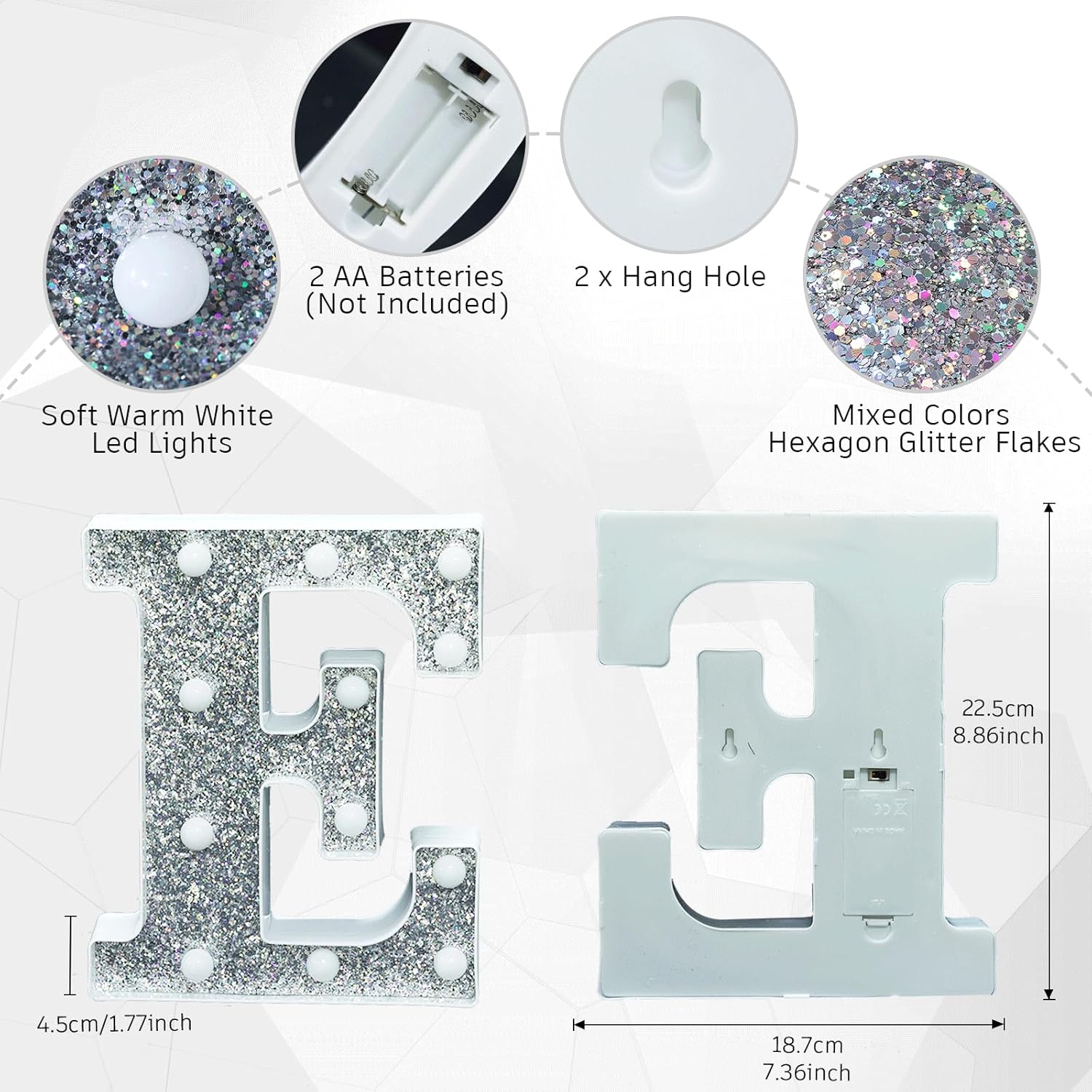 • πŸ’‘ Elegant Glitter Light-Up Letters with Silver Diamond Finish: These LED marquee light up letters feature a stunning glitter effect combined with a sophisticated silver diamond surface. Including all 26 alphabet letters and 10 numbers, these light up letters bring sparkle and elegance to any space, making them the perfect light letters for party decor, especially as light up letters for table settings or wall accents.
