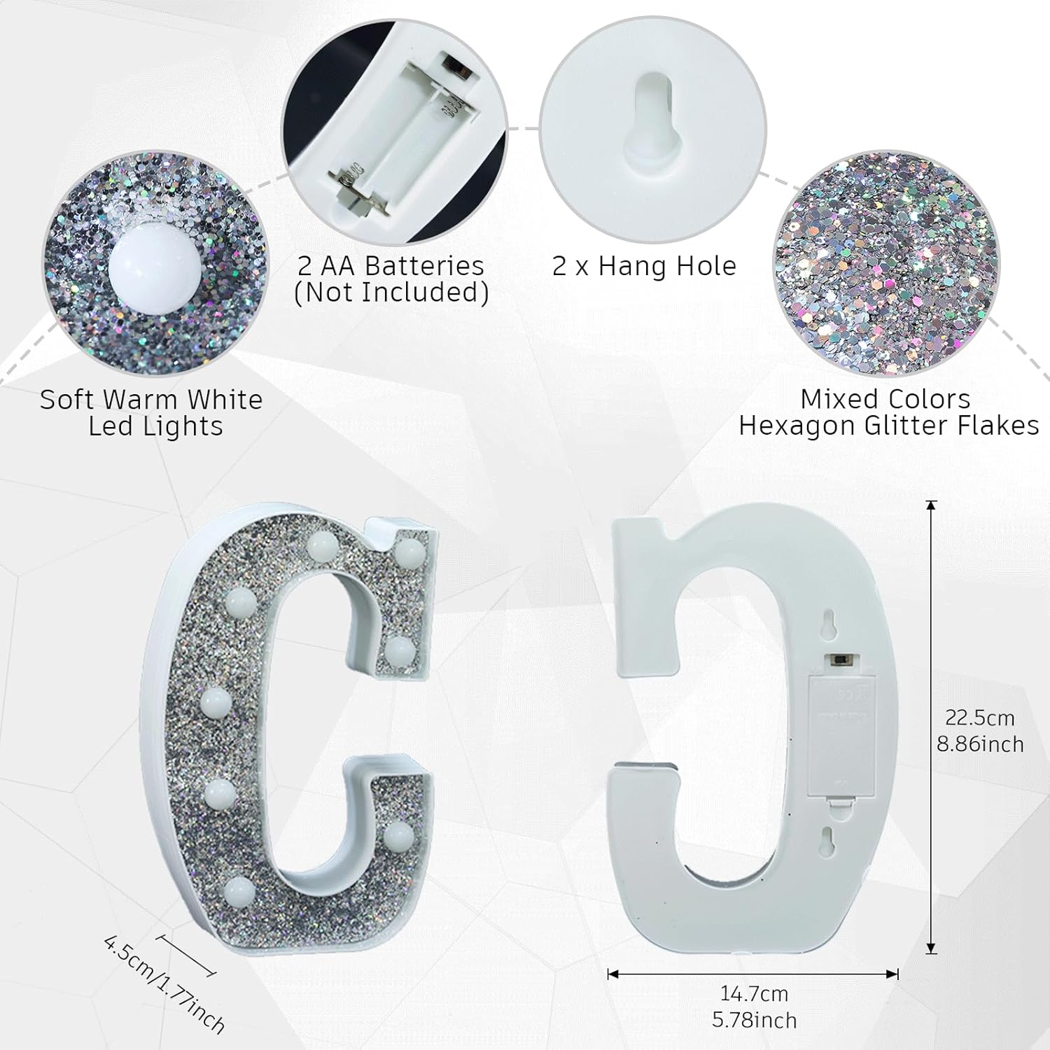 • ๐Ÿ’ก Elegant Glitter Light-Up Letters with Silver Diamond Finish: These LED marquee light up letters feature a stunning glitter effect combined with a sophisticated silver diamond surface. Including all 26 alphabet letters and 10 numbers, these light up letters bring sparkle and elegance to any space, making them the perfect light letters for party decor, especially as light up letters for table settings or wall accents.