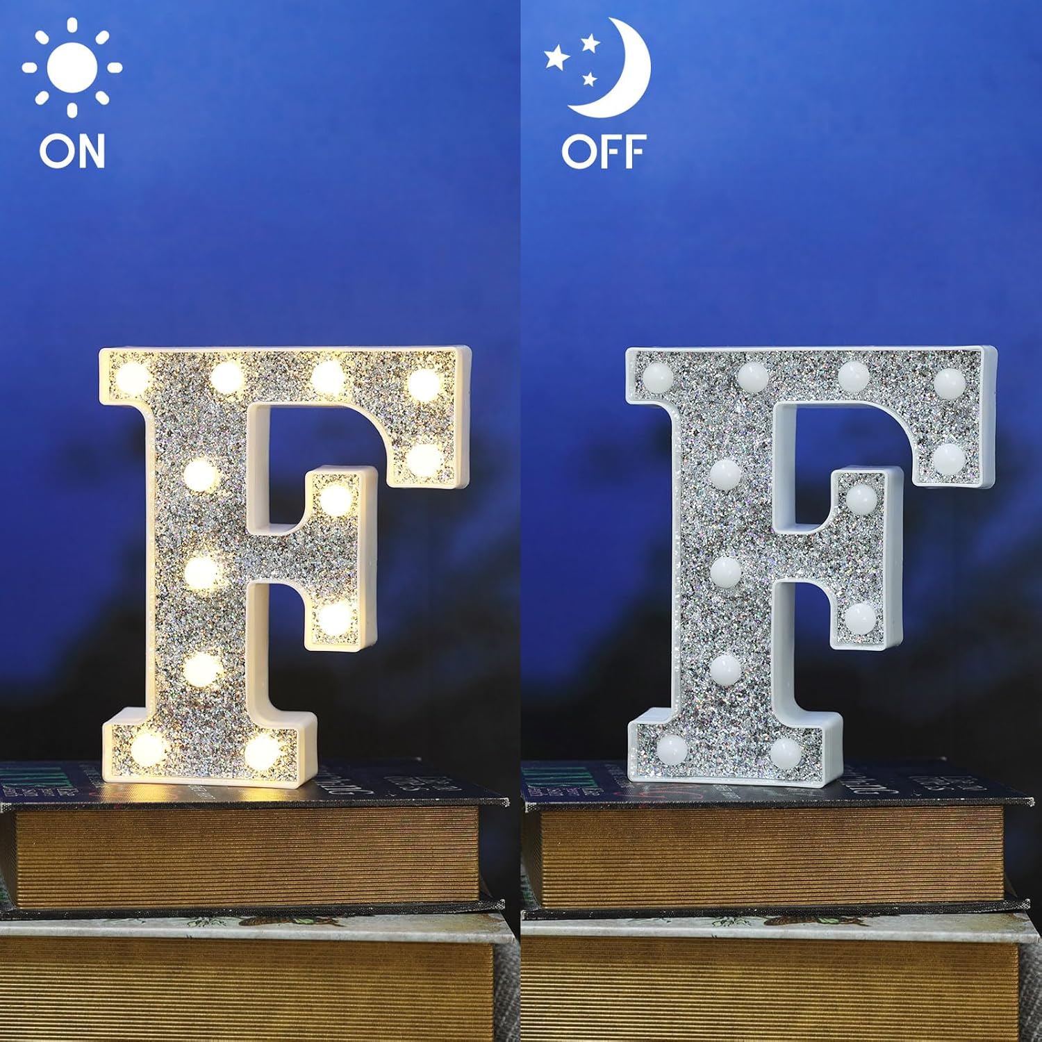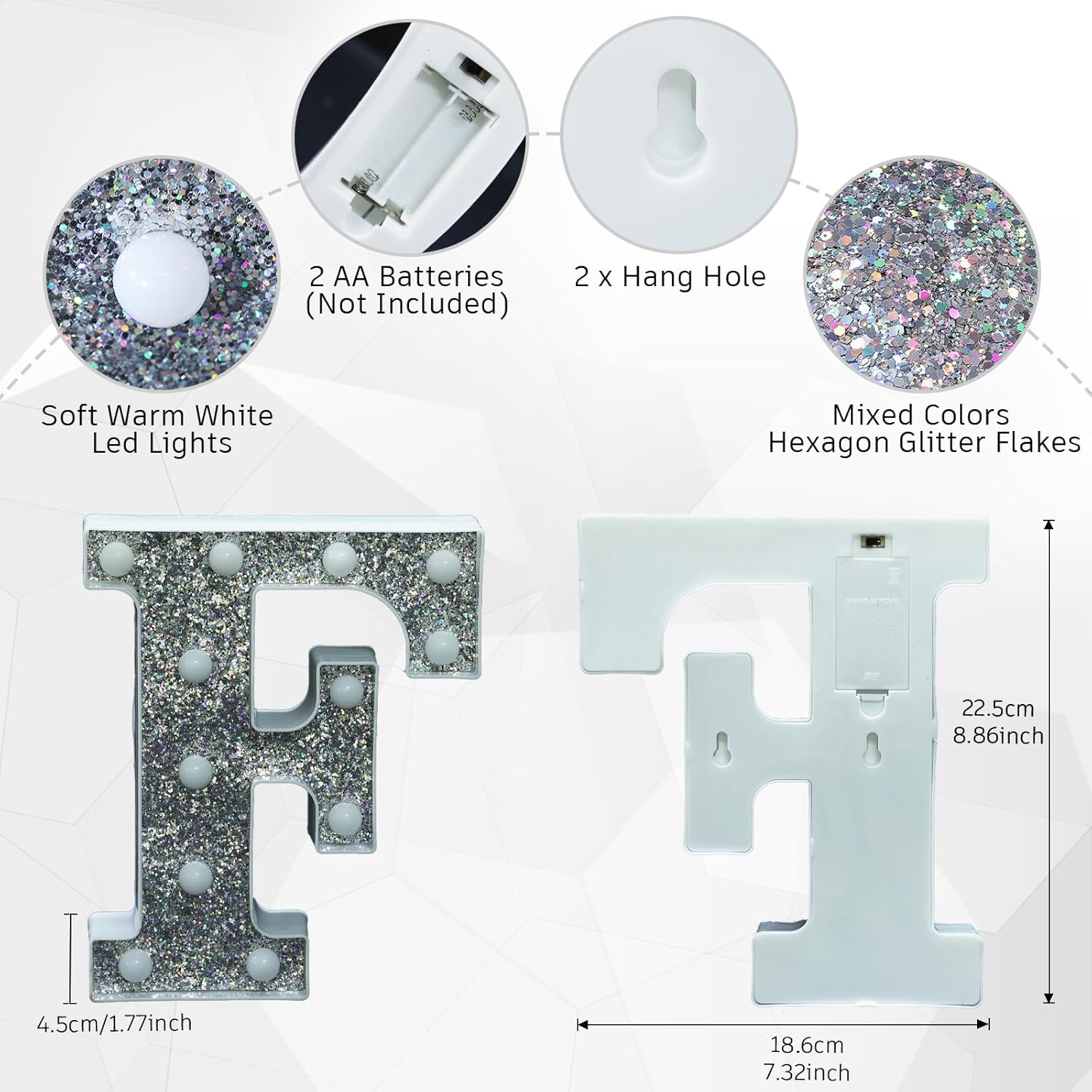 • πŸ’‘ Elegant Glitter Light-Up Letters with Silver Diamond Finish: These LED marquee light up letters feature a stunning glitter effect combined with a sophisticated silver diamond surface. Including all 26 alphabet letters and 10 numbers, these light up letters bring sparkle and elegance to any space, making them the perfect light letters for party decor, especially as light up letters for table settings or wall accents.
