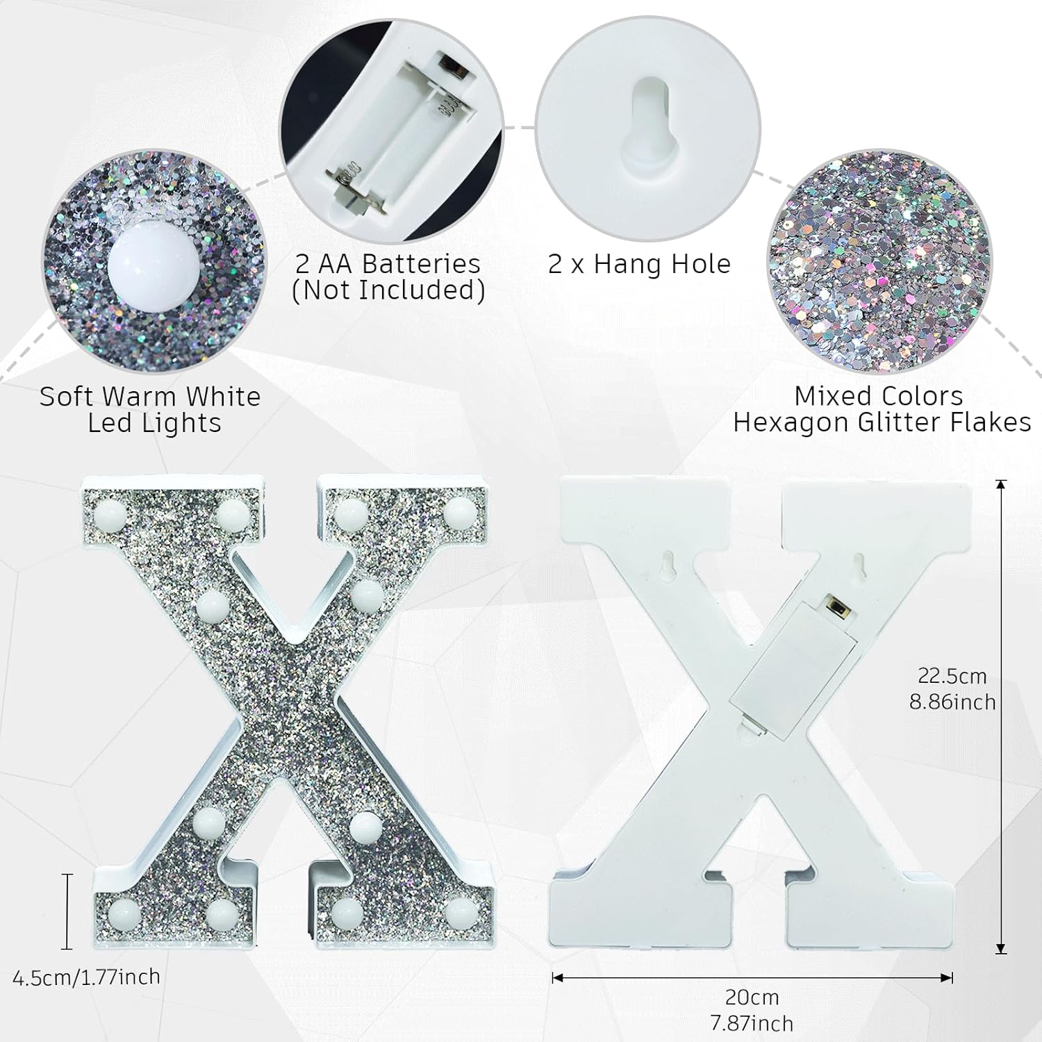 • πŸ’‘ Elegant Glitter Light-Up Letters with Silver Diamond Finish: These LED marquee light up letters feature a stunning glitter effect combined with a sophisticated silver diamond surface. Including all 26 alphabet letters and 10 numbers, these light up letters bring sparkle and elegance to any space, making them the perfect light letters for party decor, especially as light up letters for table settings or wall accents.