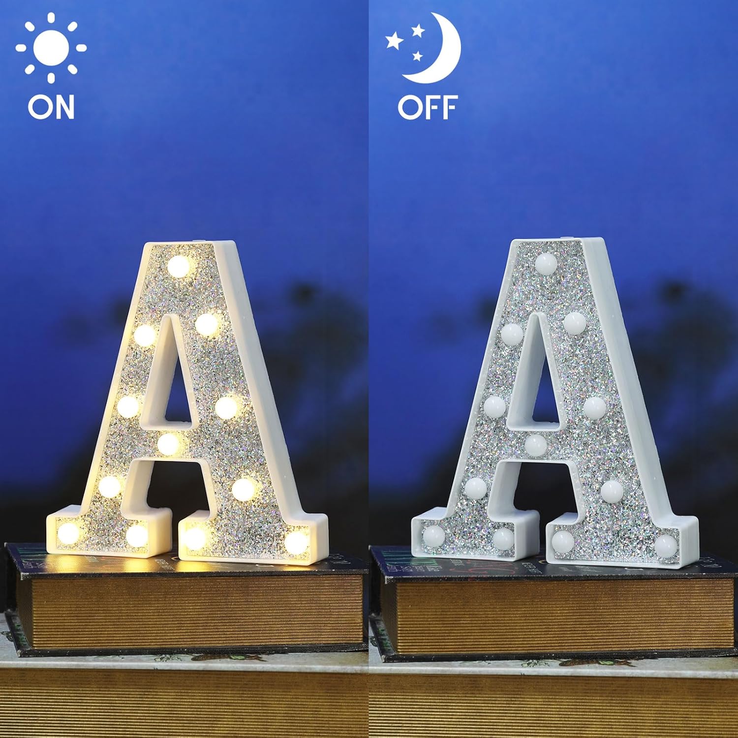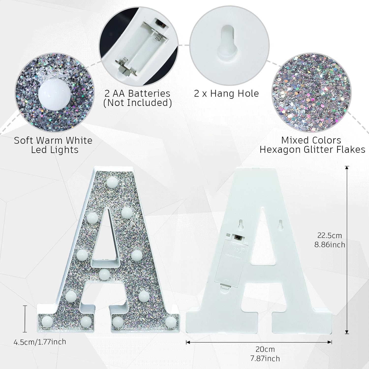 • ๐Ÿ’ก Elegant Glitter Light-Up Letters with Silver Diamond Finish: These LED marquee light up letters feature a stunning glitter effect combined with a sophisticated silver diamond surface. Including all 26 alphabet letters and 10 numbers, these light up letters bring sparkle and elegance to any space, making them the perfect light letters for party decor, especially as light up letters for table settings or wall accents.