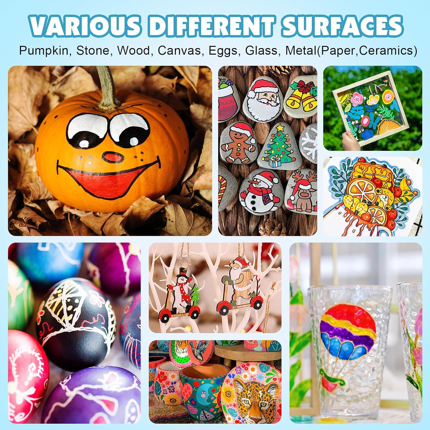 • 【Widely Used】Paint pens acrylic markers have the characteristics of strong coverage,quick drying,and smoothness, making them suitable for various surfaces.such as canvas,wood,metal, rock painting,glasses,plastic,paper,ceramics,and more.
