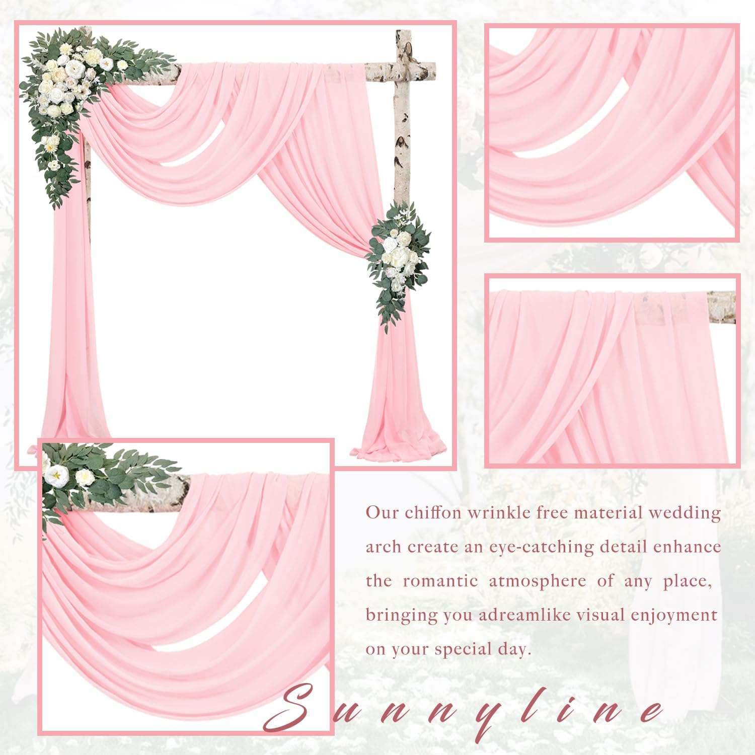 • Wedding Arch Draping Fabric Material: The wedding arch draping fabric is high-quality chiffon fabric, it is very smooth to the touch, soft and does not wrinkle. They create an eye-catching detail that brings long-lasting visual enjoyment, they are perfect for wedding decorations and ceremonies.