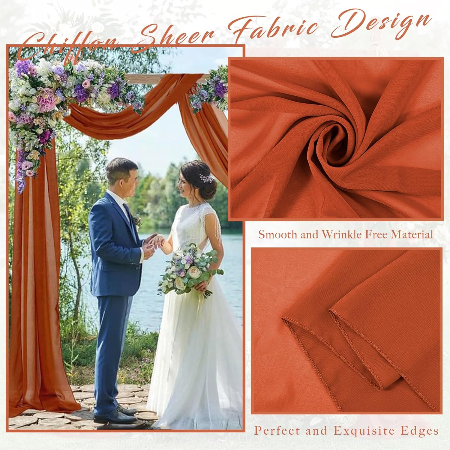 • Wedding Arch Draping Fabric Material: The wedding arch draping fabric is high-quality chiffon fabric, it is very smooth to the touch, soft and does not wrinkle. They create an eye-catching detail that brings long-lasting visual enjoyment, they are perfect for wedding decorations and ceremonies.