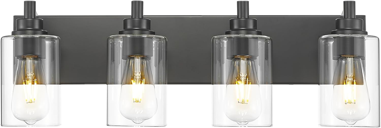 4-Light Bathroom Light Fixtures, Black Vanity Light with Cylinder Clear Glass Shade, Modern Vanity Lighting Fixtures Over Mirror, VL143-MB-4