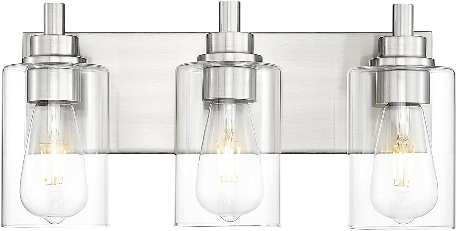 3-Light Bathroom Light Fixtures, Brushed Nickel Vanity Light with Cylinder Clear Glass Shade, Modern Vanity Lighting Fixtures Over Mirror, VL143-BN-3