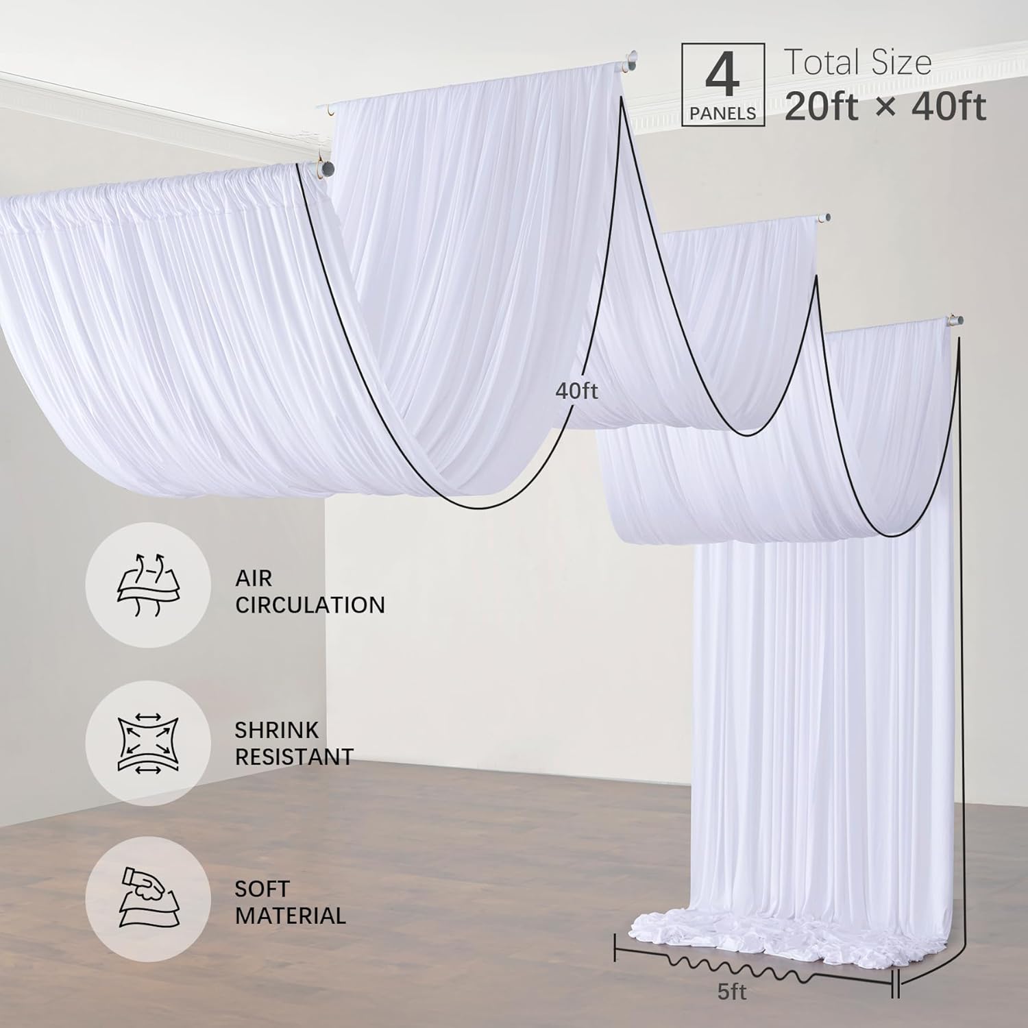PartyVillage 20ftx40ft White Ceiling Curtain for Wedding Parties – 4 Panels Wrinkle-Free 40 FT Long Tent Draping Curtains for Wedding, Birthday & Theme Parties, 40ft Height with Rod Pocket