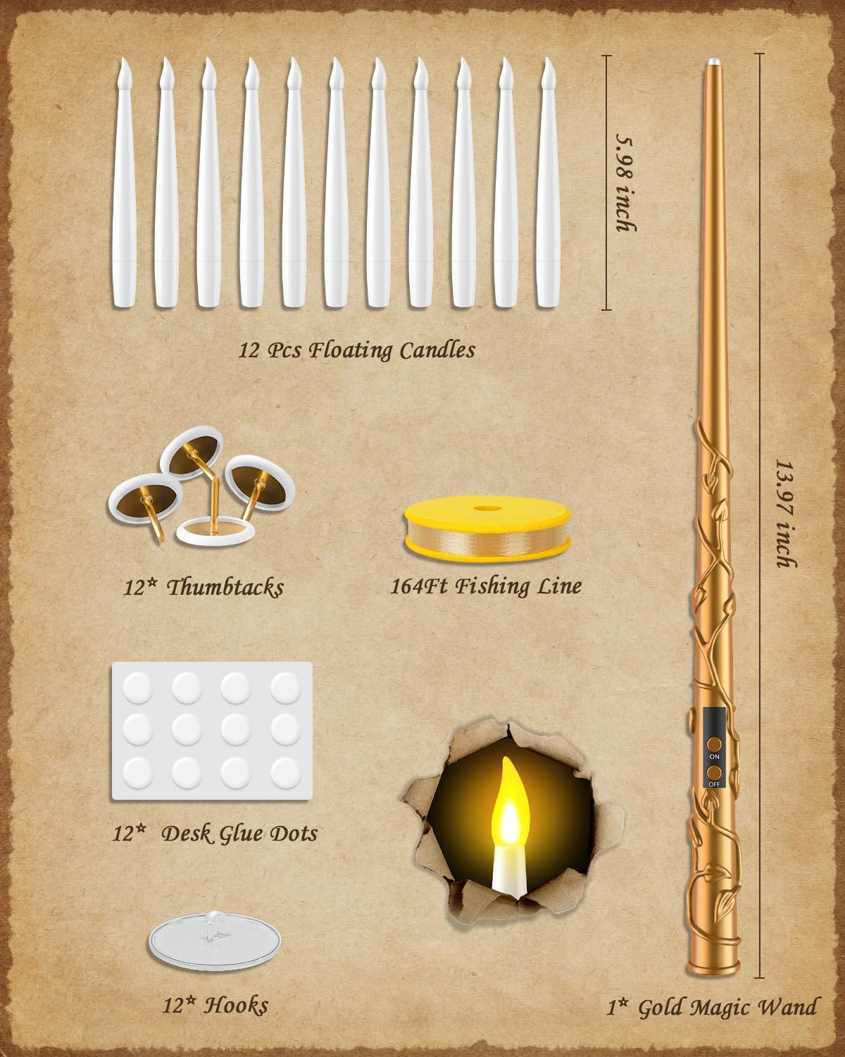 • 𝑯𝒂𝒏𝒈𝒊𝒏𝒈 𝒄𝒂𝒏𝒅𝒍𝒆𝒔 𝒇𝒐𝒓 𝑴𝒂𝒈𝒊𝒄 𝑫𝒆𝒄𝒐𝒓𝒂𝒕𝒊𝒐𝒏𝒔: TLPUHU Hanging taper candles come with 164FT fishing line, 12 adhesive hooks, and all necessary accessories for easy installation. Effortlessly enhance your decor by hanging them anywhere you desire, such as on your Christmas tree, bedroom / room ceiling, walls, windows, fireplace, porch, pumpkin, ghosts or elegantly placing them on a candlesticks or table. Customize your house with ease and creativity.