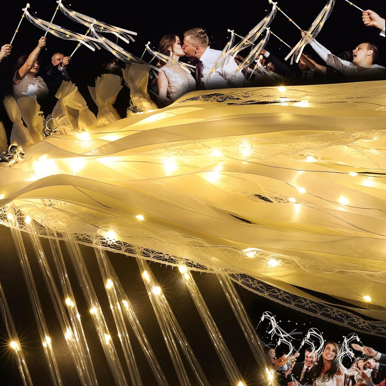 25 Pcs Wedding Wands Ribbon Streamers with 3 Colorful Flashing Modes, Light up LED Silk Fairy Wands, Glow Lace Stick with Bells for Wedding Reception, Graduation, New Year, Birthday Party (Warm White)