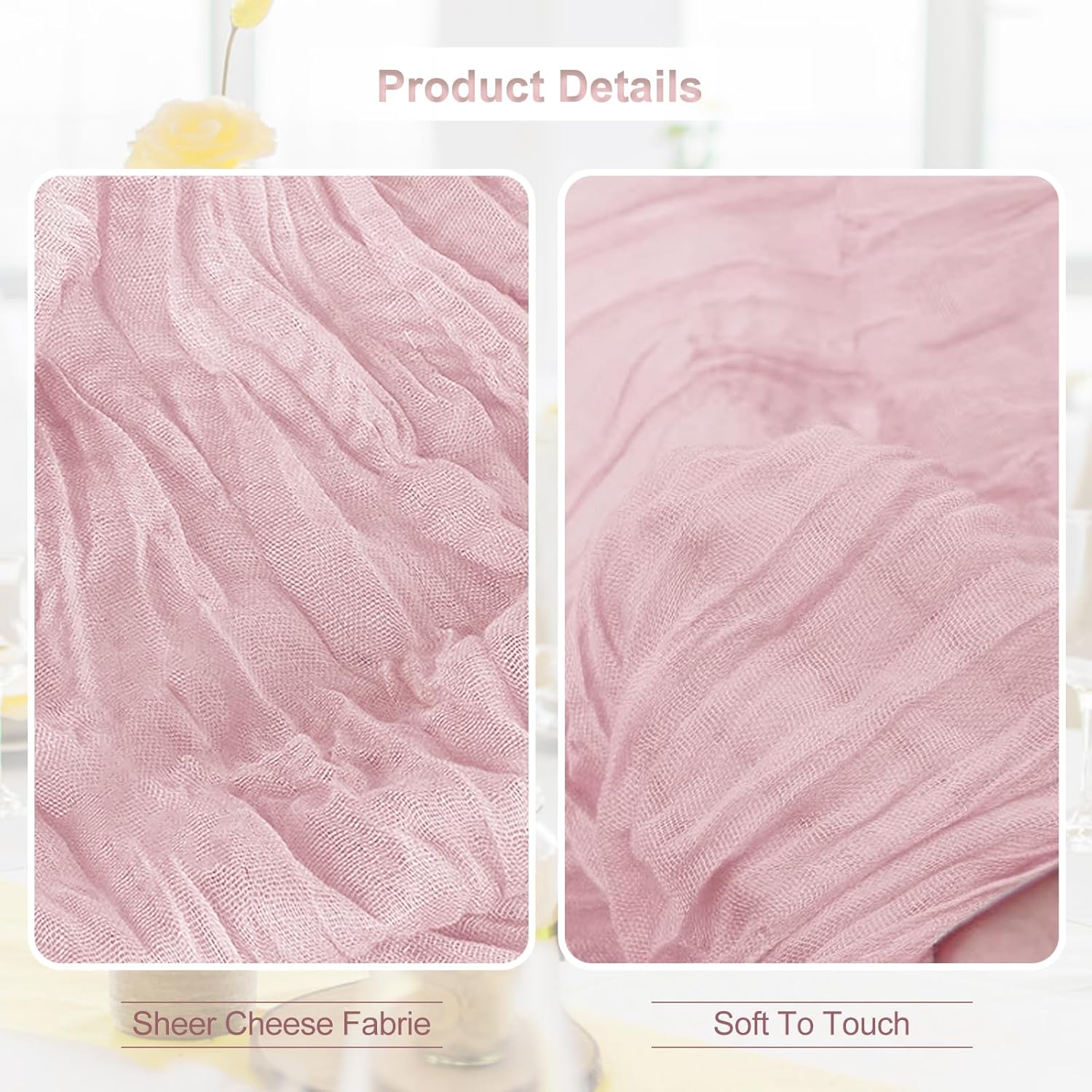 • Premium Materials: Our table runners are crafted from high-quality cheesecloth and gauze. The dusty pink cheesecloth table runner has good softness and breathability, while the gauze table runner offers a delicate and elegant texture. These materials are carefully selected to ensure durability and a luxurious feel, making your table look and feel extraordinary.