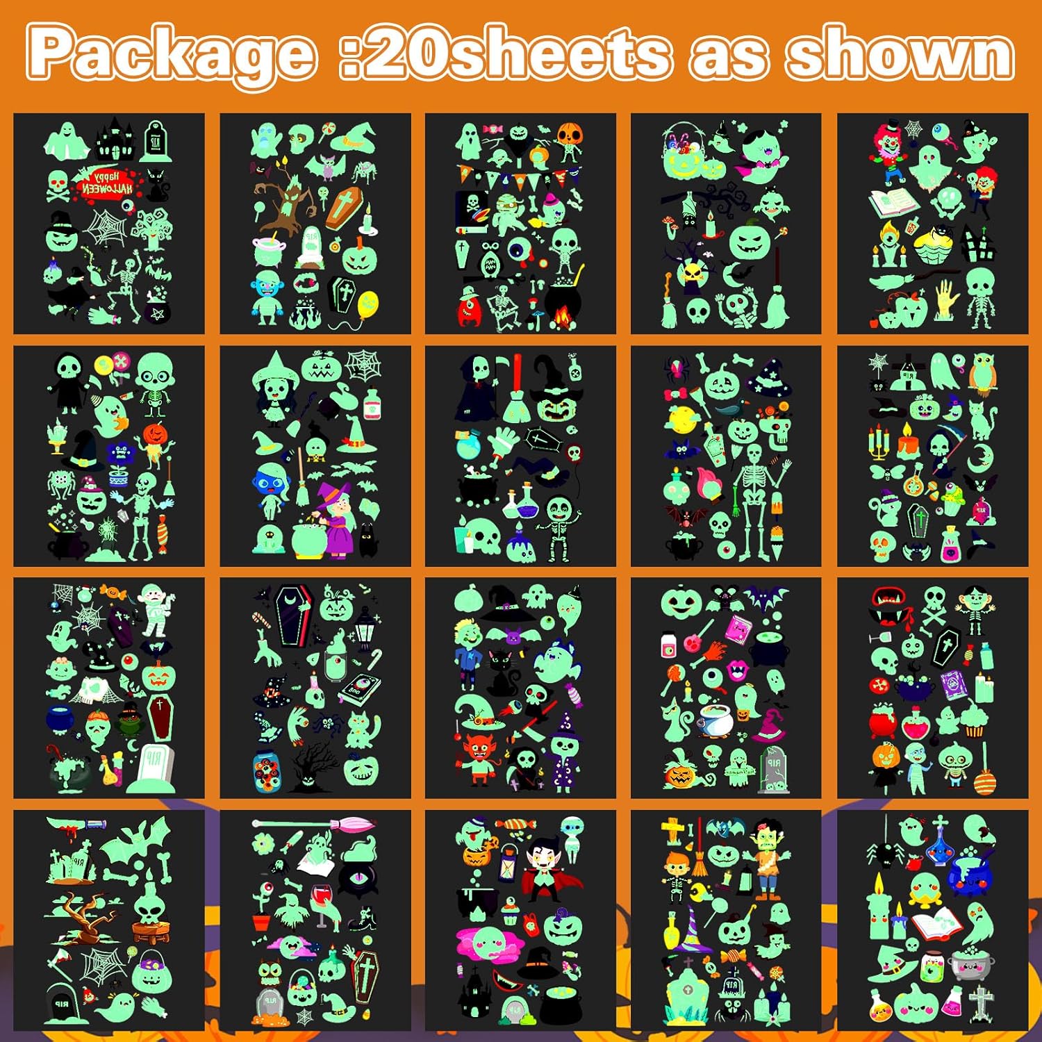 • 【Glow-in-the-Dark Halloween Tattoos for Kids】 Bring the magic of Halloween to life with our Luminous Temporary Tattoos for Kids! This set includes 20 sheets (4.33 " x 2.95") featuring 360 unique bat designs, include classic Halloween designs such as pumpkins, ghosts, skeletons, spider, bats, spider webs, zombies, skeletons, candy, witches, eyeball etc. Perfect for Halloween parties, these tattoos are easy to activate by simply exposing them to light for a few minutes.