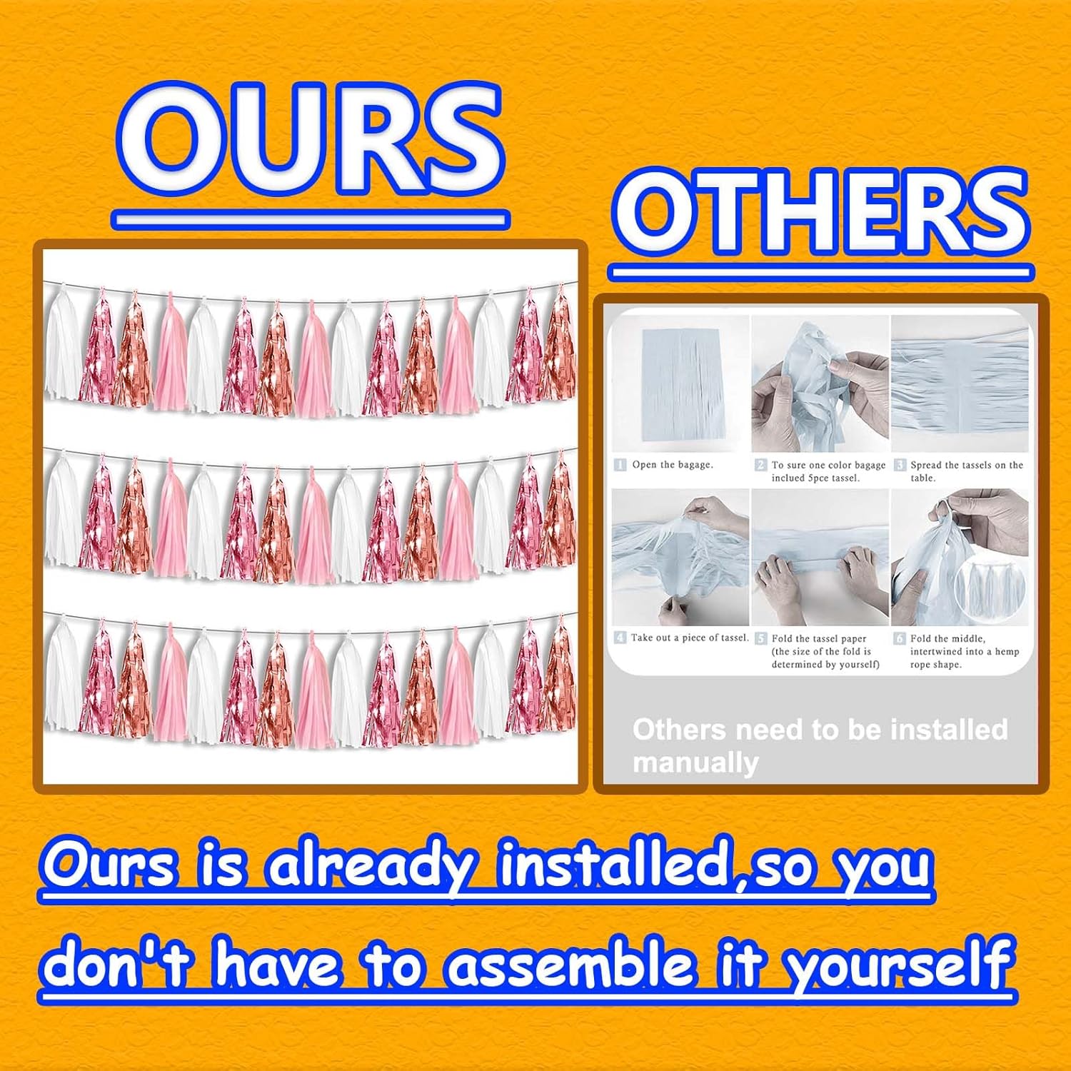 • 【Package Includes】The total length of the rose gold pink white birthday tassels banner is 30 feet, divided into 3 strips, each 10 feet long. Each banner contains 15 tassels, and each tassel measures 14 inches, for birthday decorations many occasions uitable for Patriotic display, Homecoming Float, Christmas Float, ecorative metal trailers, graduation floats etc