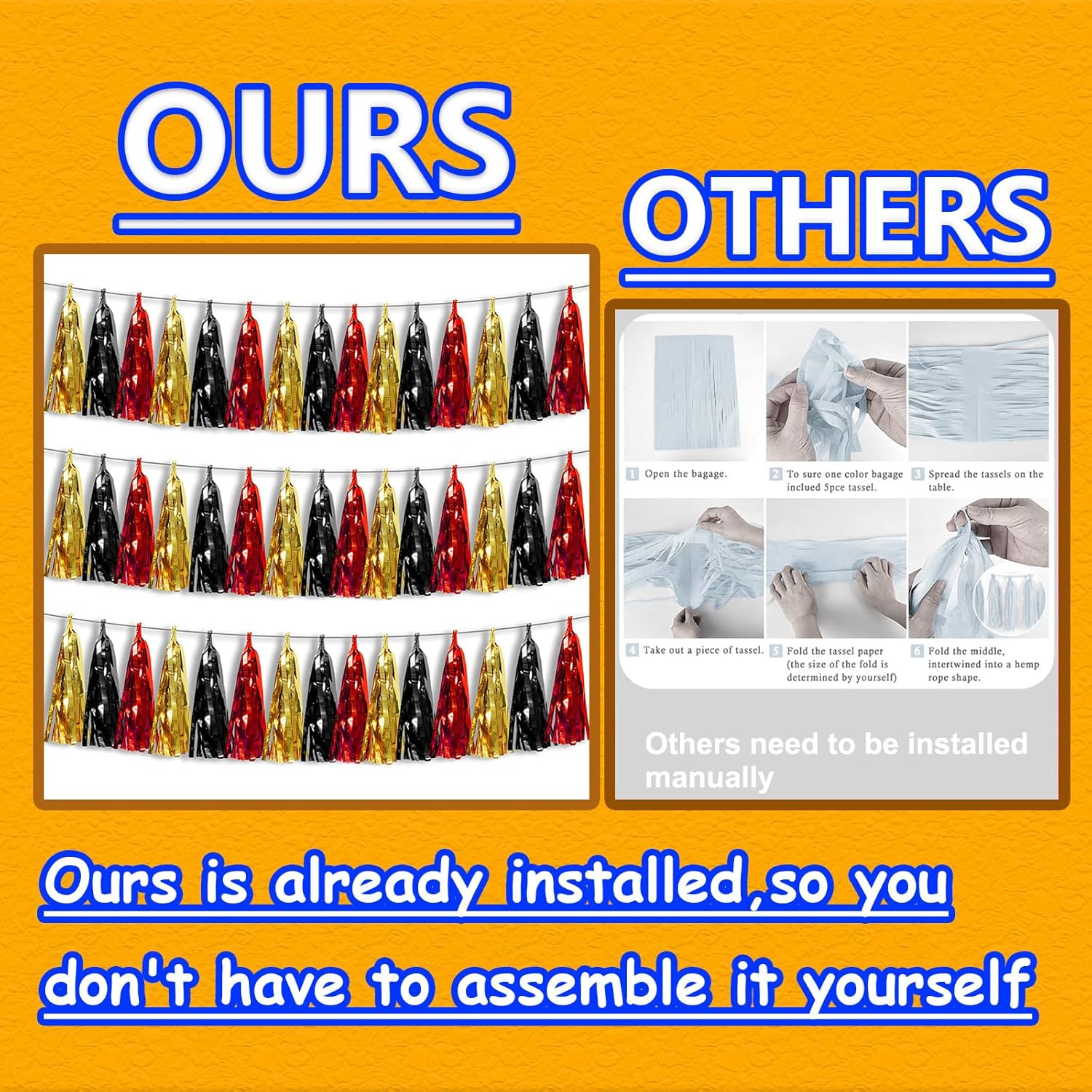 • 【Package Includes】The total length of the red black gold birthday tassels banner is 30 feet, divided into 3 strips, each 10 feet long. Each banner contains 15 tassels, and each tassel measures 14 inches, for birthday decorations many occasions uitable for Patriotic display, omecoming Float, Christmas Float, ecorative metal trailers, graduation floats etc