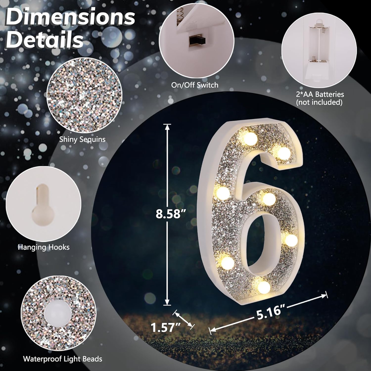 Marquee Light Up Letters, Glitter Silver LED Letter Lights Battery Powered Alphabet Letter Sign for Night Light Wedding Birthday Party Cafe Bar Decoration Girls Room Decor - Number 6