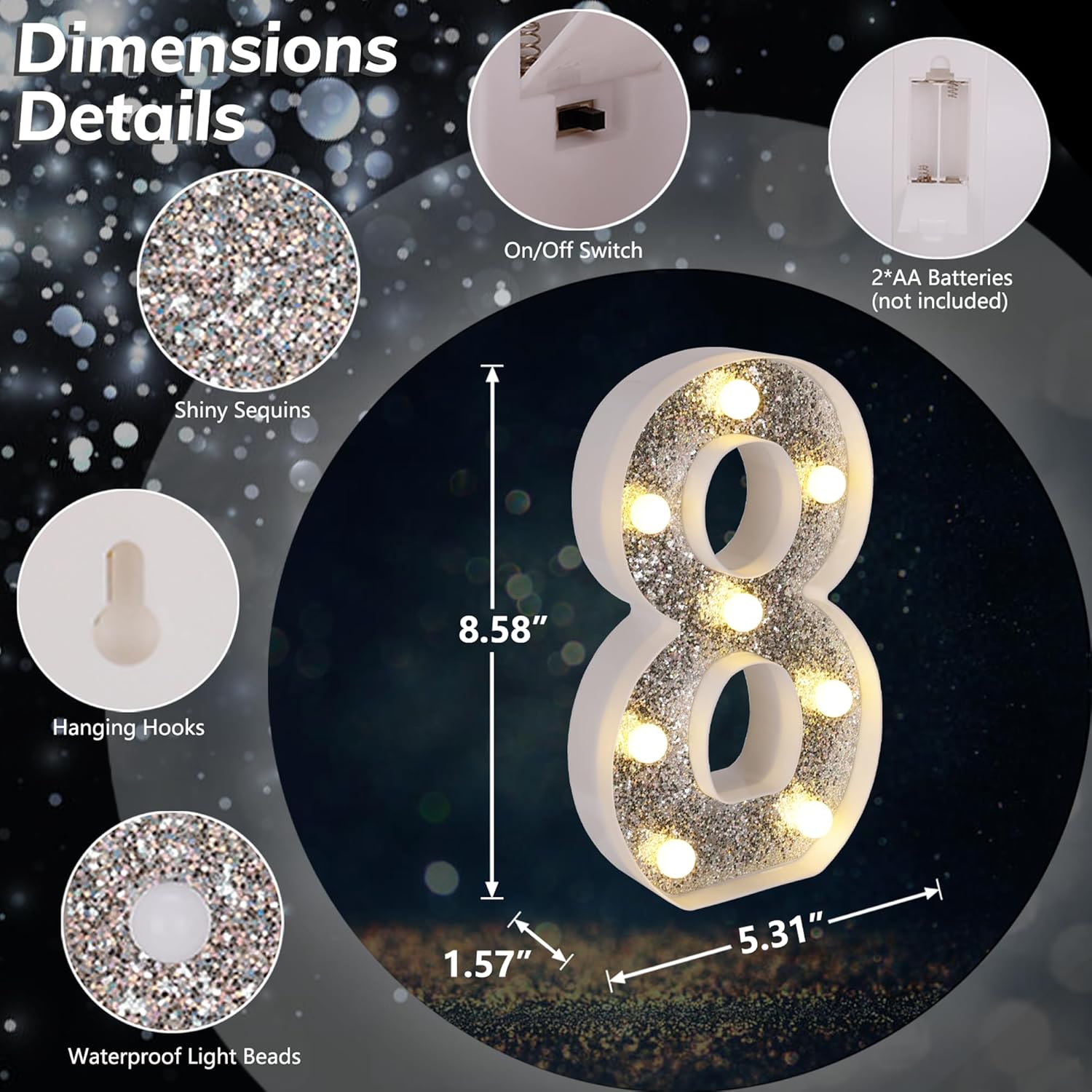 Marquee Light Up Letters, Glitter Silver LED Letter Lights Battery Powered Alphabet Letter Sign for Night Light Wedding Birthday Party Cafe Bar Decoration Girls Room Decor - Number 8