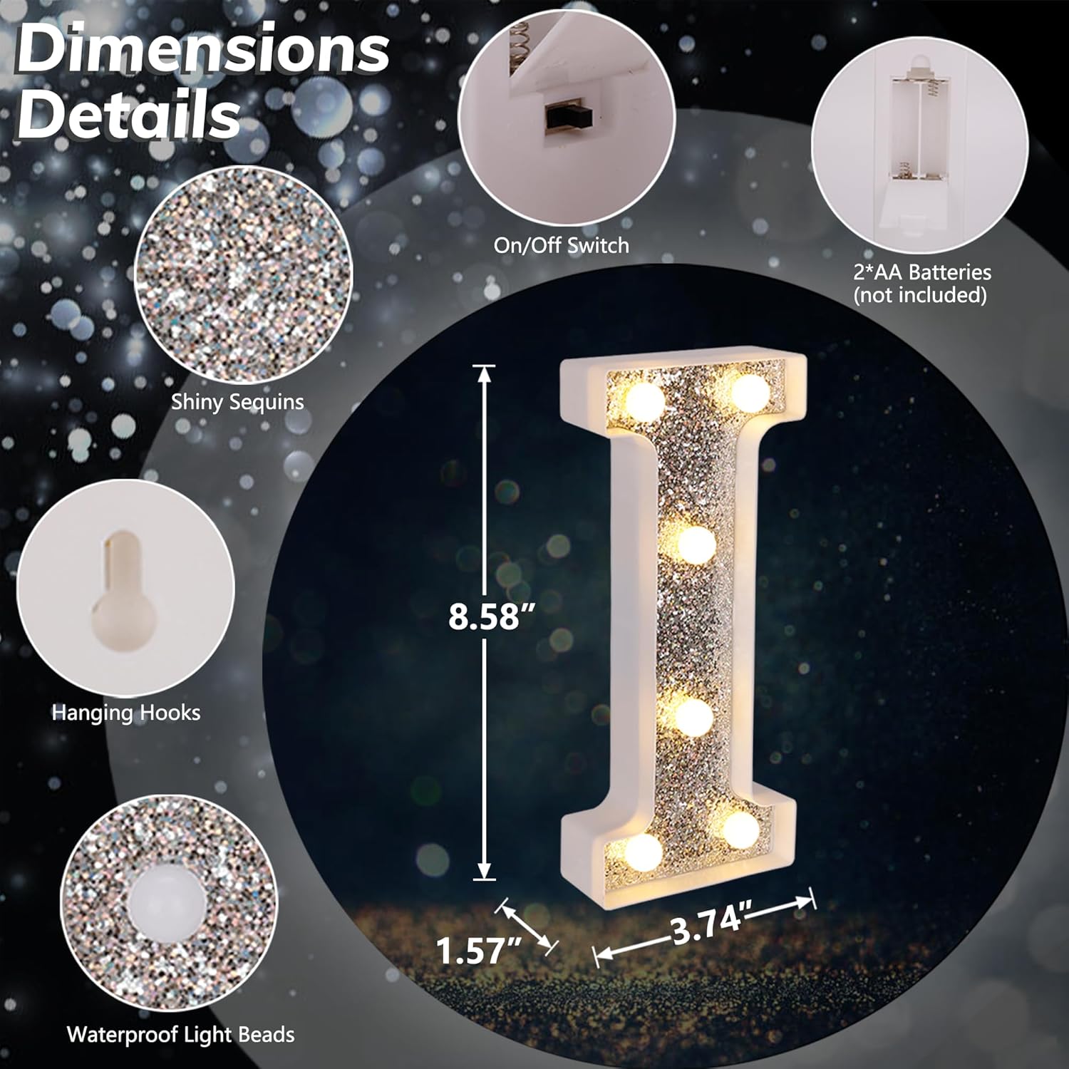 Marquee Light Up Letters, Glitter Silver LED Letter Lights Battery Powered Alphabet Letter Sign for Night Light Wedding Birthday Party Cafe Bar Decoration Girls Room Decor - I