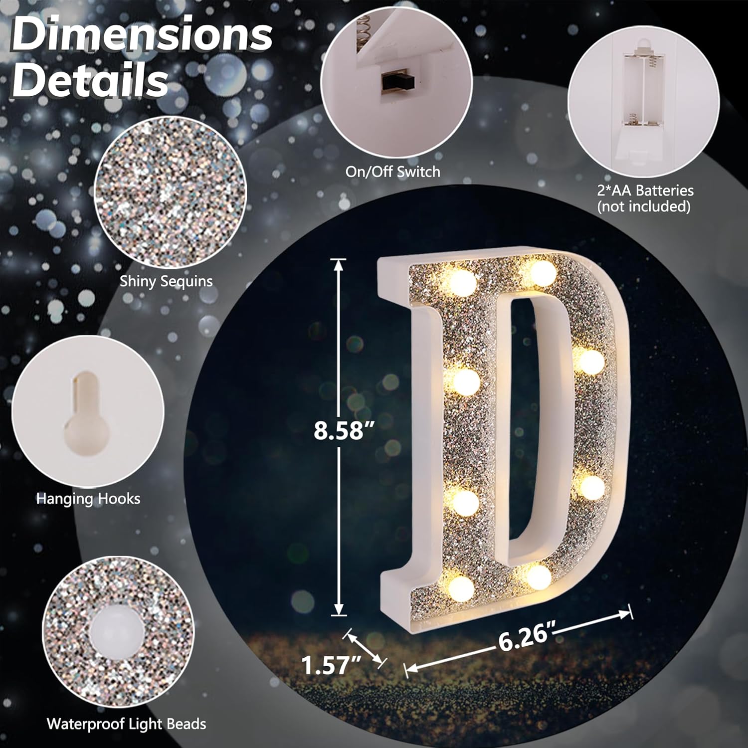 Marquee Light Up Letters, Glitter Silver LED Letter Lights Battery Powered Alphabet Letter Sign for Night Light Wedding Birthday Party Cafe Bar Decoration Girls Room Decor - D