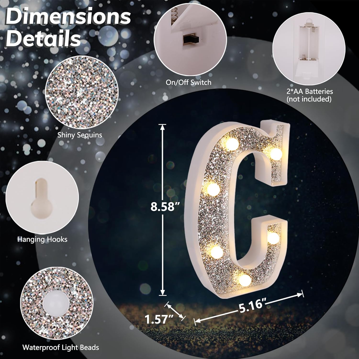 Marquee Light Up Letters, Glitter Silver LED Letter Lights Battery Powered Alphabet Letter Sign for Night Light Wedding Birthday Party Cafe Bar Decoration Girls Room Decor - C