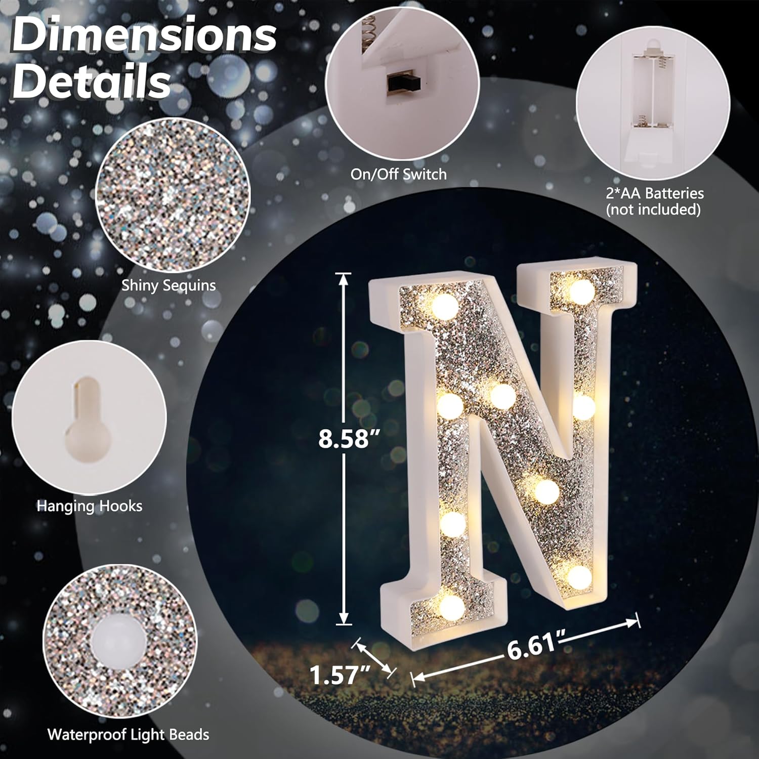 • 【Glitter Silver Marquee LED Letters】Unlike normal white lighted letters, these LED letter lights are covered with shiny silver glittering sequins. Whether it is turned on or off, these glitter marquee lights give a bright eye-catching glow. You can use it to beautify your dining table and light up your party. Create a dreamlike and romantic atmosphere.