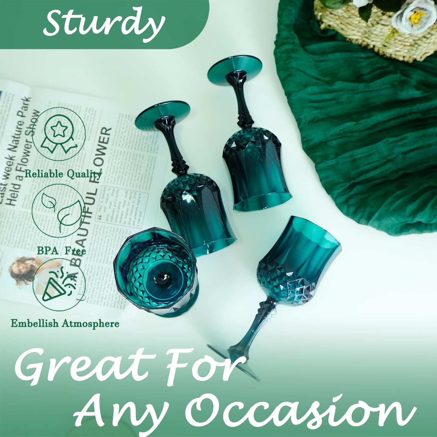 • 🍷🍷🍷【Product Description】 This set includes 48 retro-style dark green party plastic wine glasses, providing ample quantity to meet your daily use and replacement needs. The elegant and sophisticated design makes your wedding reception unique.