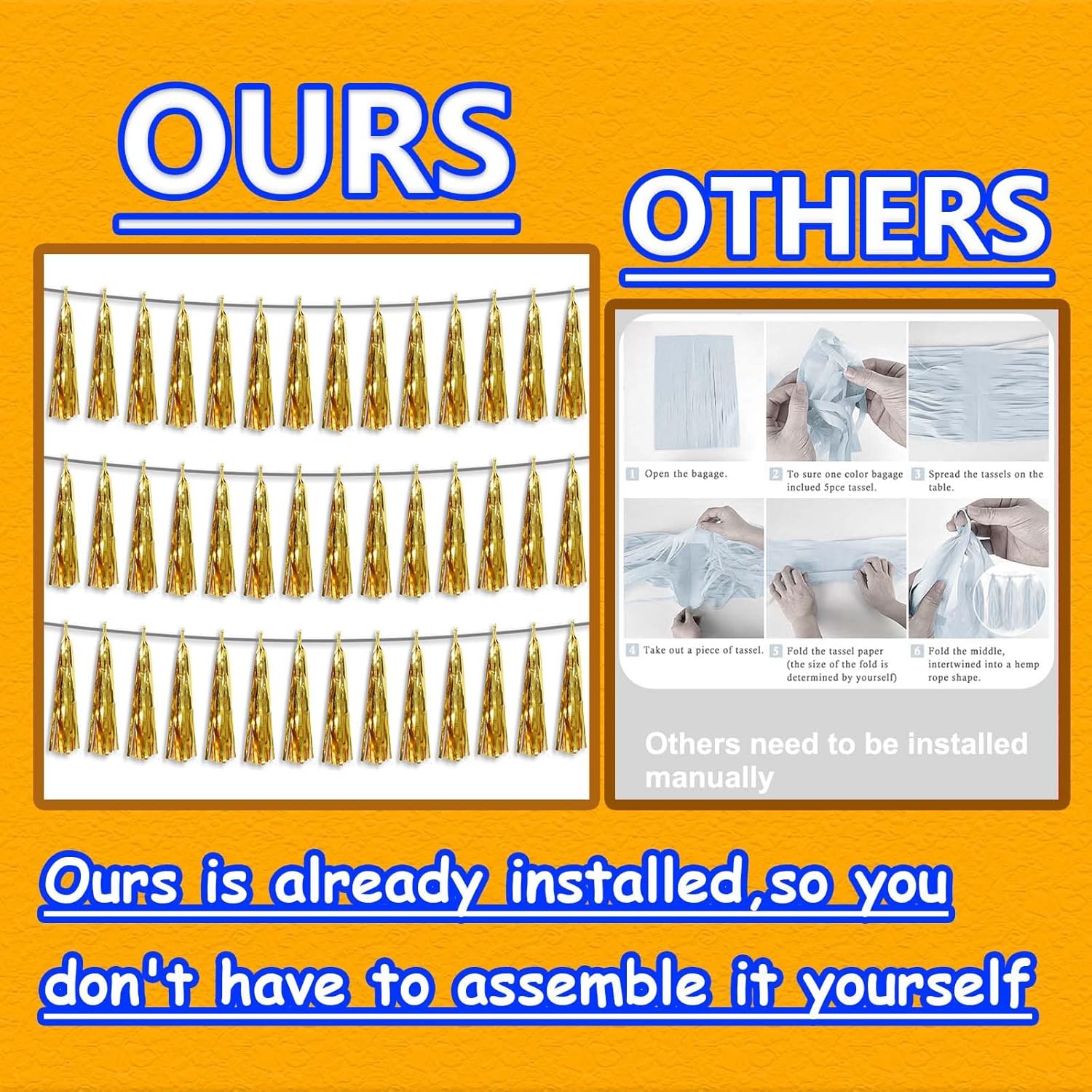 • 【Package Includes】The total length of the gold birthday tassels banner is 30 feet, divided into 3 strips, each 10 feet long. Each banner contains 15 tassels, and each tassel measures 14 inches, for birthday decorations many occasions uitable for Patriotic display, Homecoming Float, Christmas Float, ecorative metal trailers, graduation floats etc