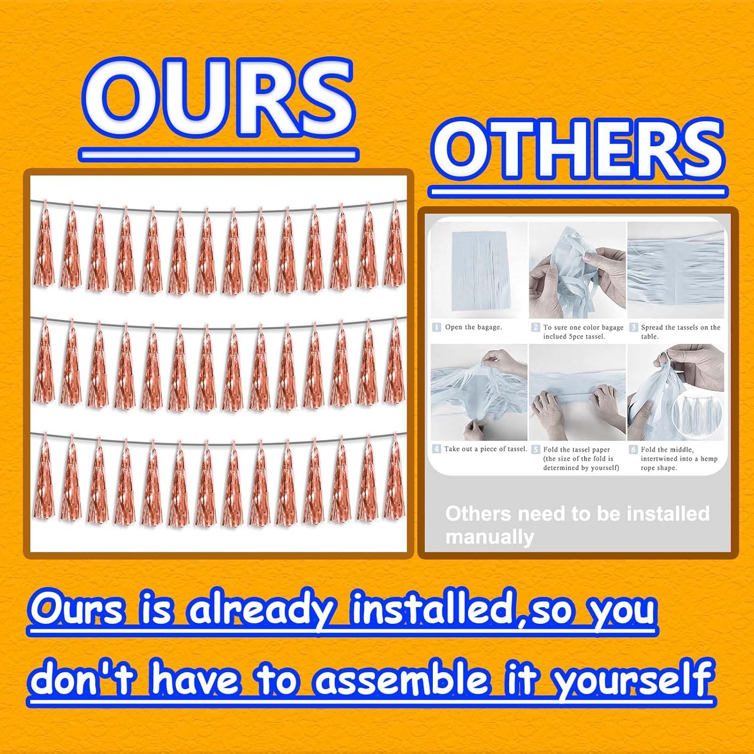 • 【Package Includes】The total length of the rose gold birthday tassels banner is 30 feet, divided into 3 strips, each 10 feet long. Each banner contains 15 tassels, and each tassel measures 14 inches, for birthday decorations many occasions uitable for Patriotic display, Homecoming Float, Christmas Float, ecorative metal trailers, graduation floats etc