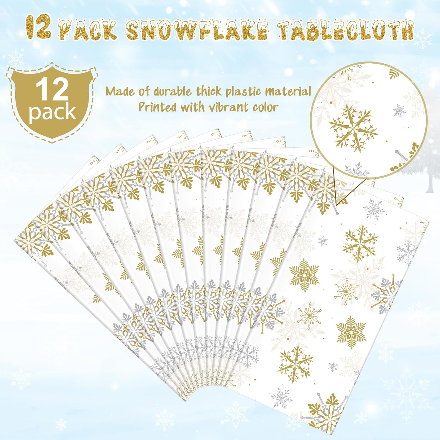 12Pcs Christmas Snowflake Party Tablecloths Decorations,Plastic White and Gold Table Cloth,Winter Rectangle Table Cover for Christmas New Year Birthday Baby Shower Holiday Party Decorations,54x108inch