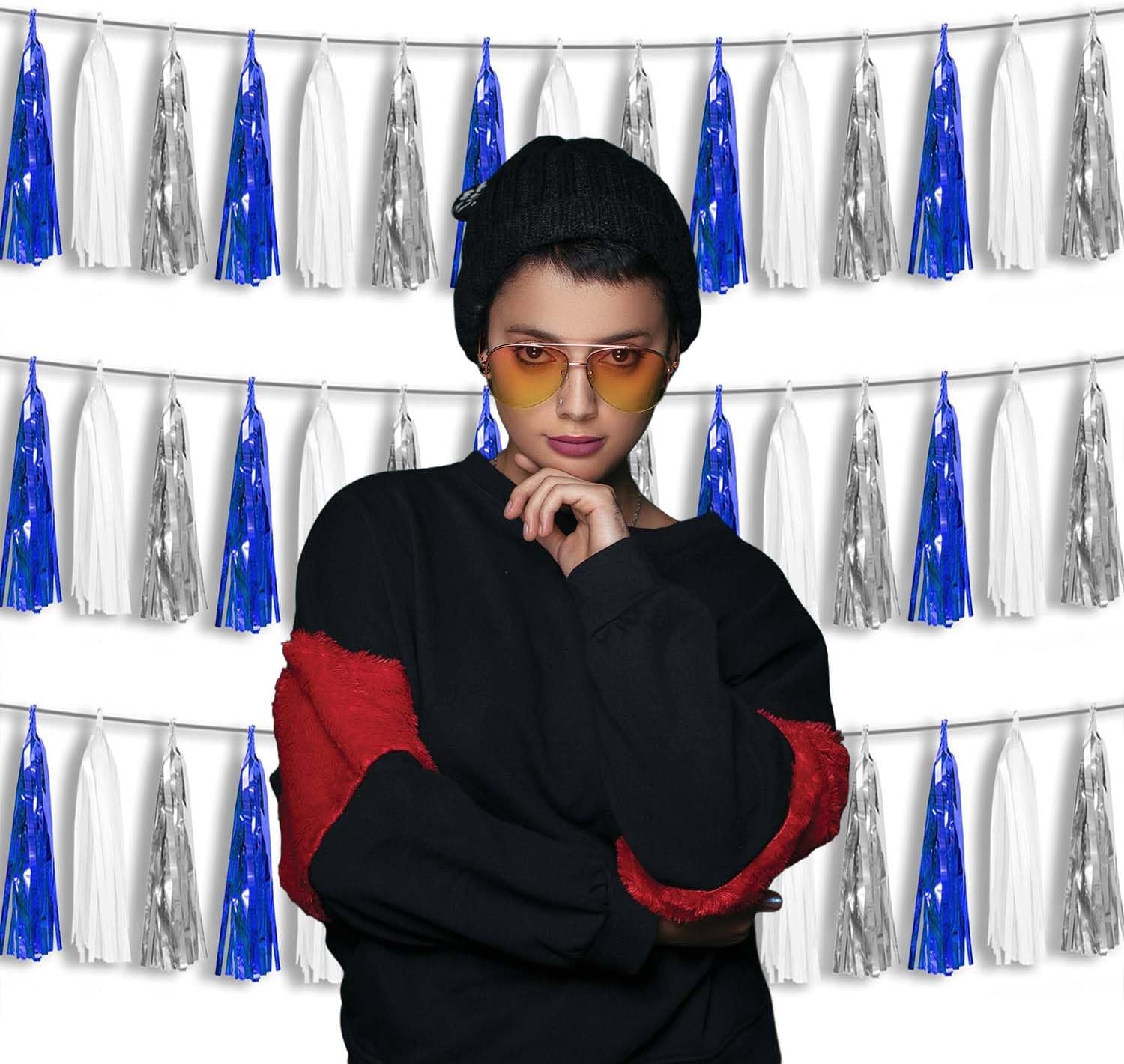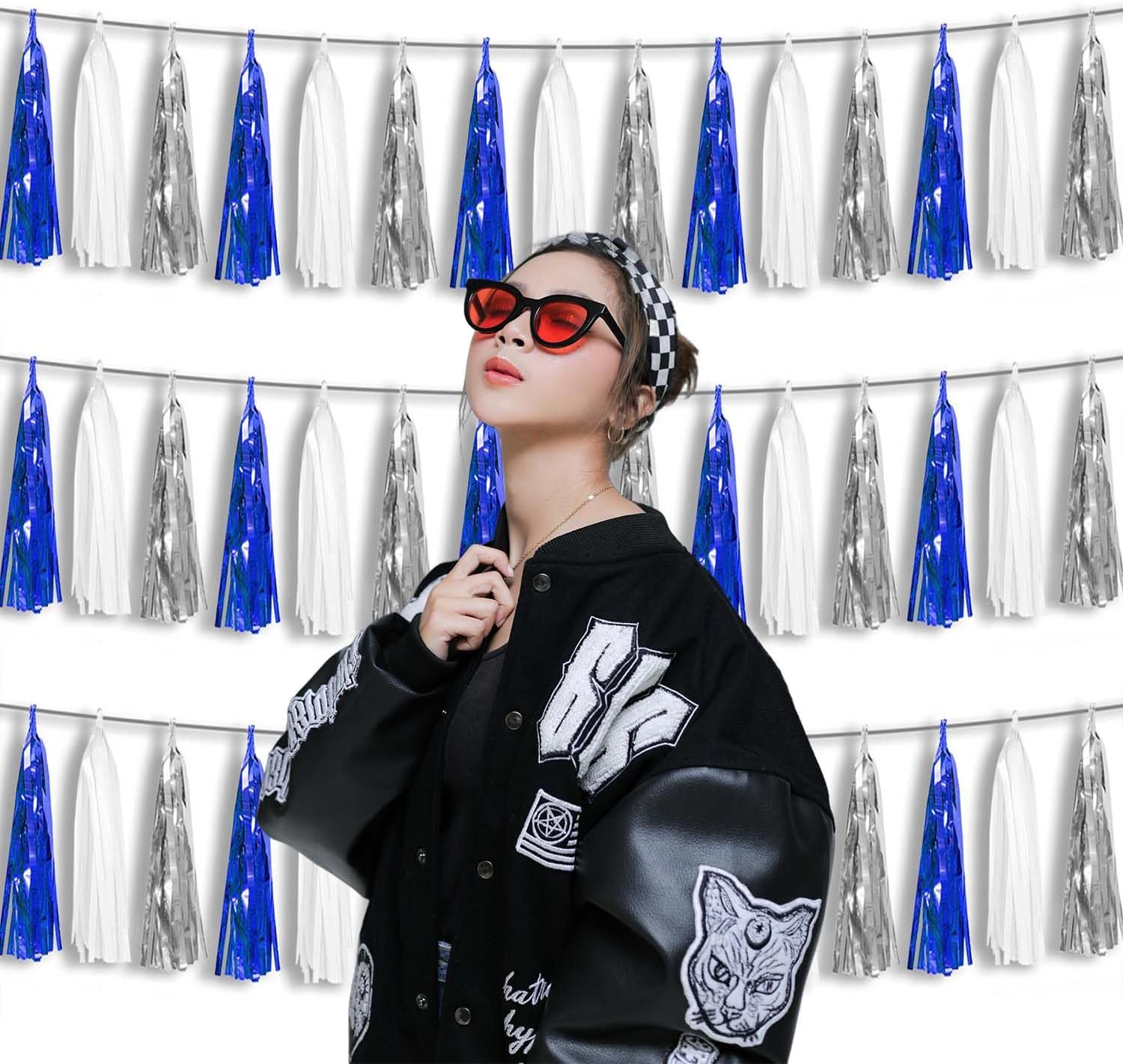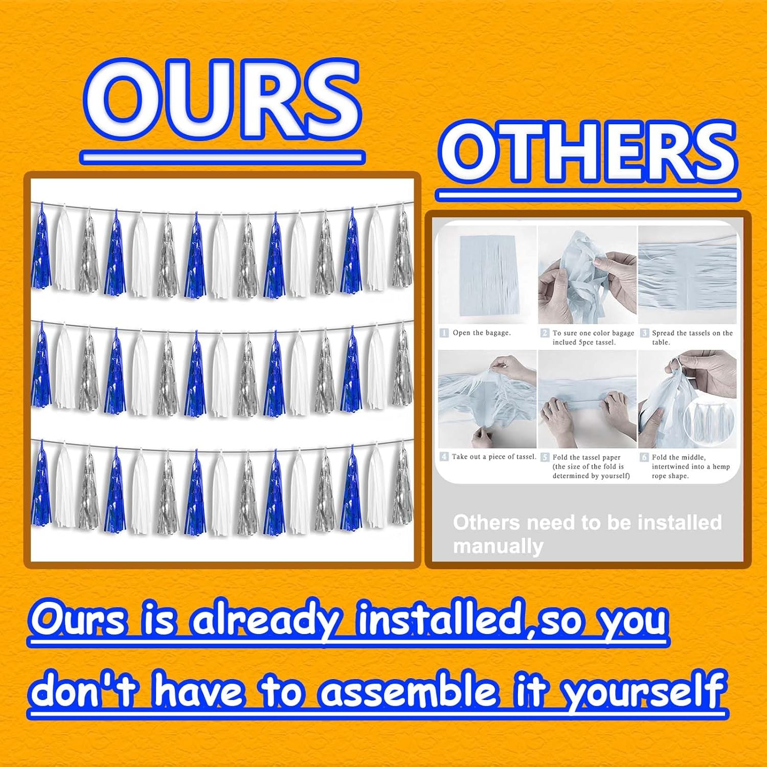 • 【Package Includes】The total length of the navy blue white silver birthday tassels banner is 30 feet, divided into 3 strips, each 10 feet long. Each banner contains 15 tassels, and each tassel measures 14 inches, for birthday decorations many occasions uitable for Patriotic display, Homecoming Float, Christmas Float, ecorative metal trailers, graduation floats etc