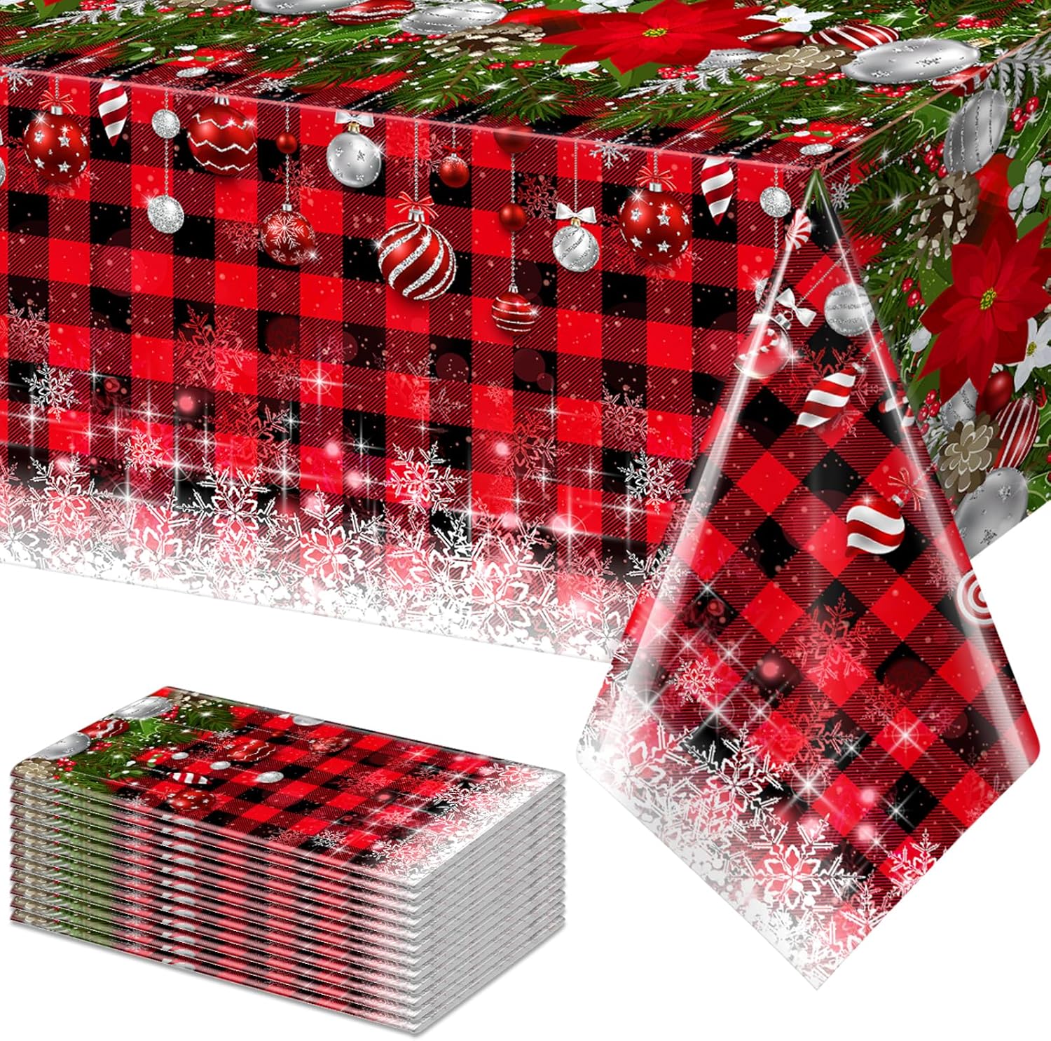 • What will you receive:12 pieces plastic Christmas party tablecloth,all over printed with white snowflake patterns and ornament on red and black buffalo plaid background,ideal for decorating your winter holiday Christmas party supplies and decorations