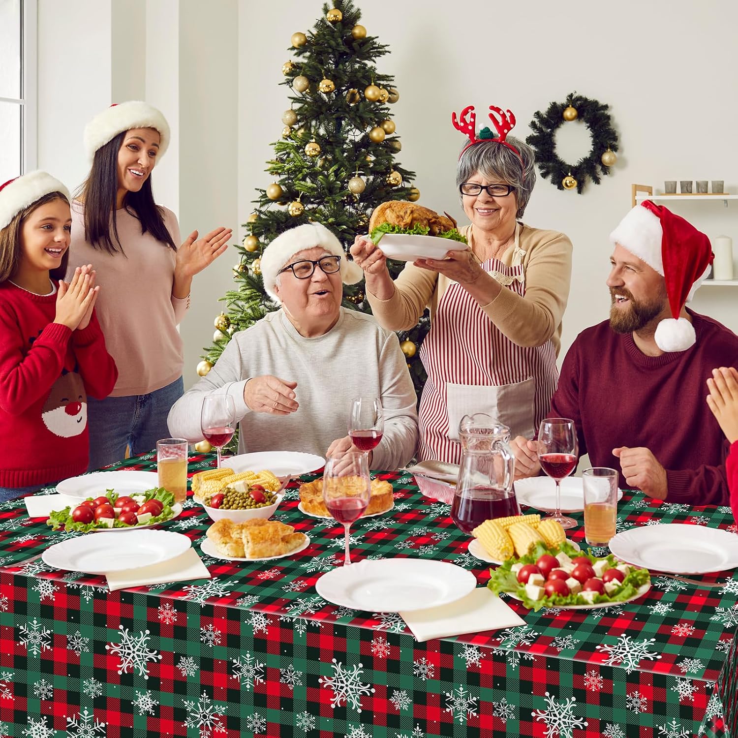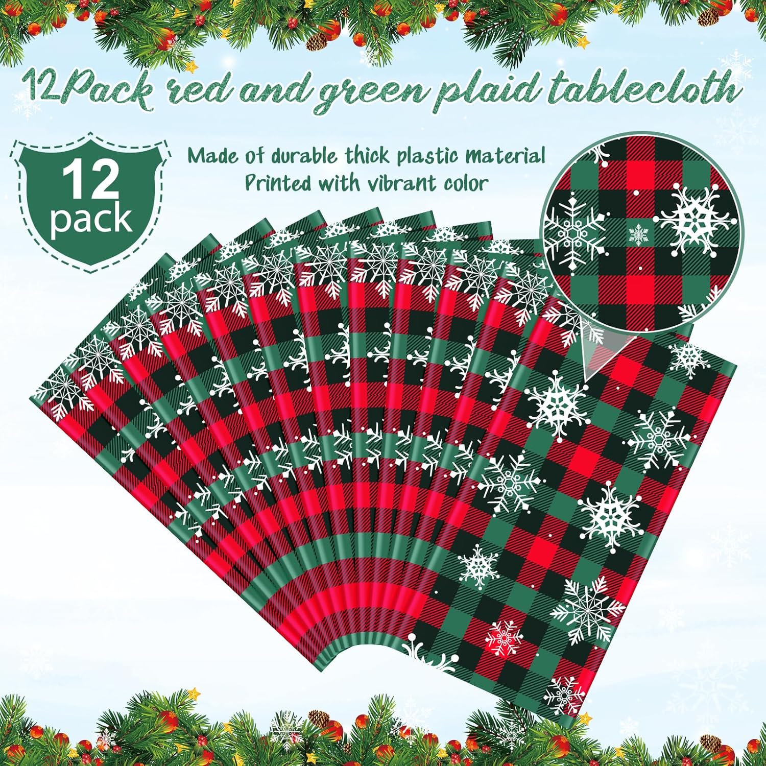 12Pcs Christmas Buffalo Plaid Snowflake Party Tablecloths Decorations,Plastic Red and Green Checkered Rectangle Table Cover for Winter Christmas New Year Birthday Holiday Party Decorations,54x108 inch