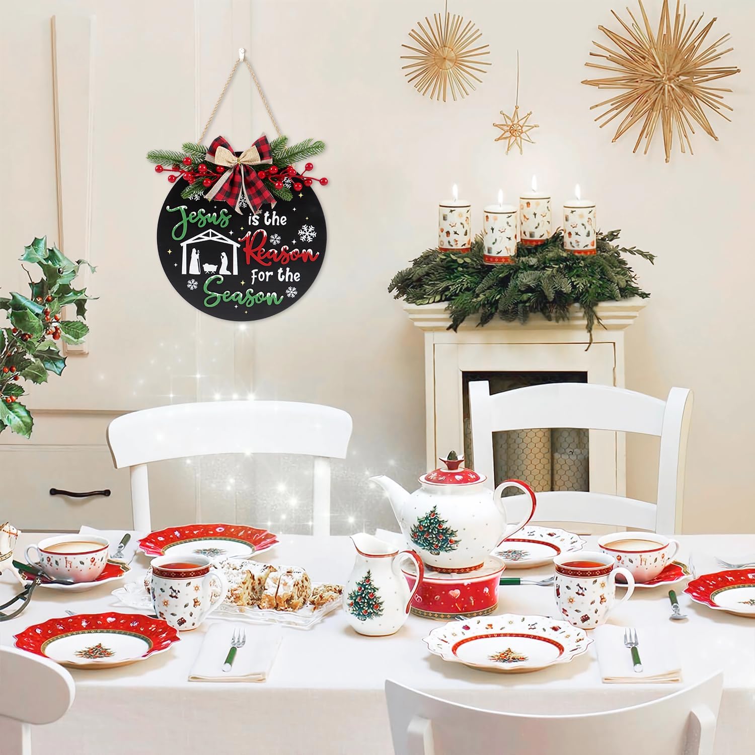 CHDITB Jesus is The Reason for The Season Front Door Sign Wreath(11.4"), Red Green Christmas Decoration Wall Hanging with Snowflakes Bow Berries, Wooden 3D Farmhouse Xmas Decor for Porch Indoor