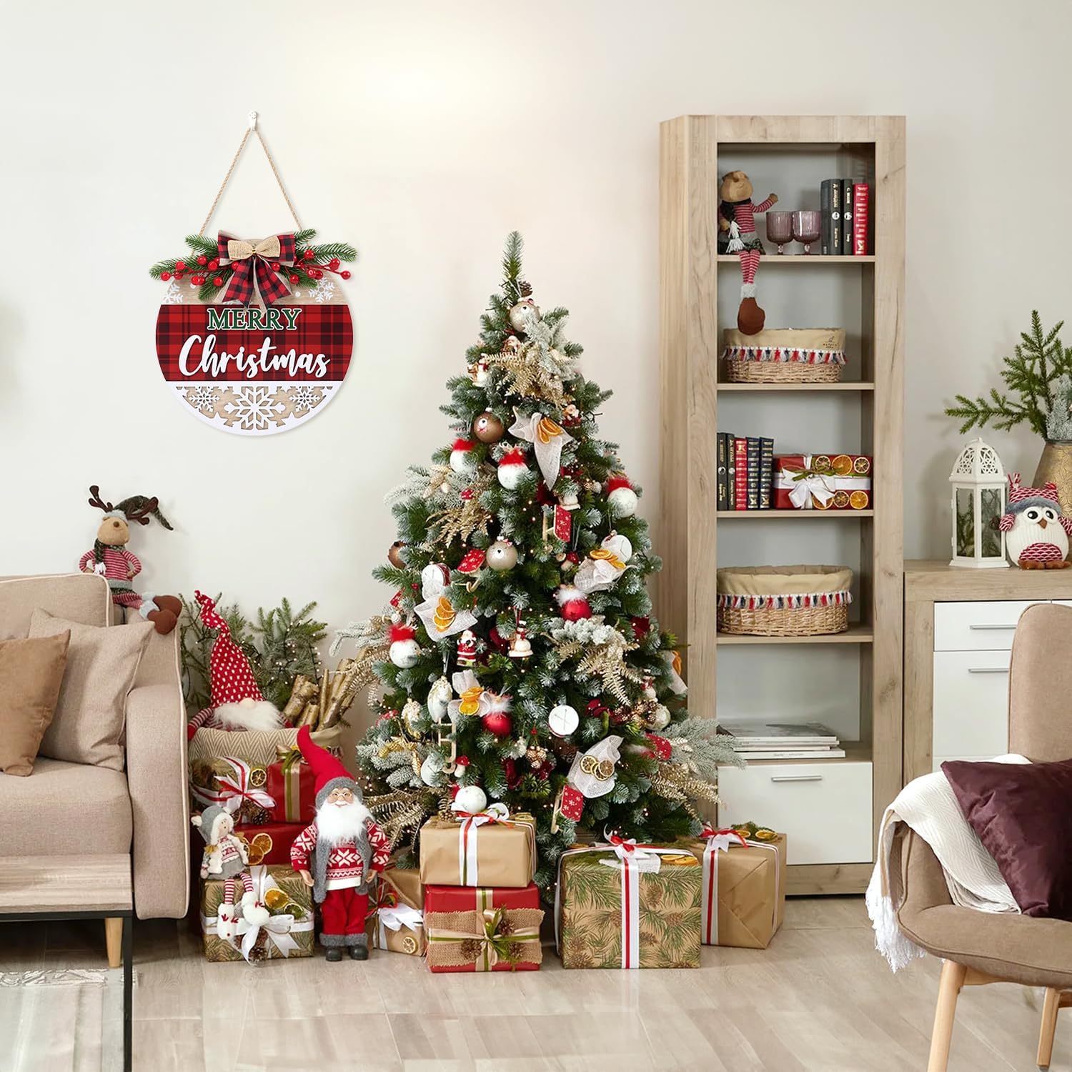 CHDITB 3D Merry Christmas Front Door Sign Wreath(11.4”), Red Black Bufflao Plaid Christmas Decoration Wall Hanging with Snowflakes Berries Mistletoe, Rustic Farmhouse Xmas Decor for Home Winter Party