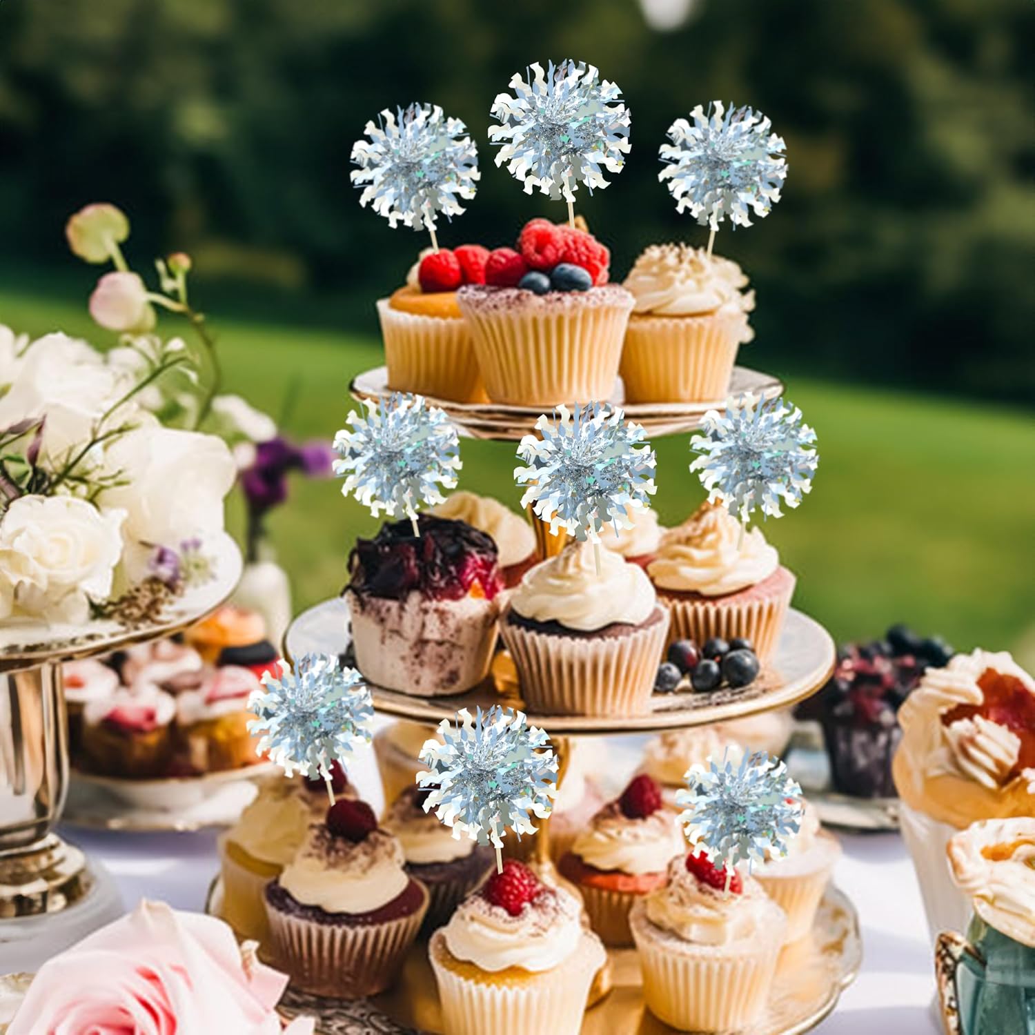 Ephlyn 30Pcs Foil Firework Cupcake Toppers Happy Birthday Cake Toppers Tinsel Flower Drink Stirrers Cocktail Food Fruit Toothpicks for Valentine's Day Party Decorations Silver
