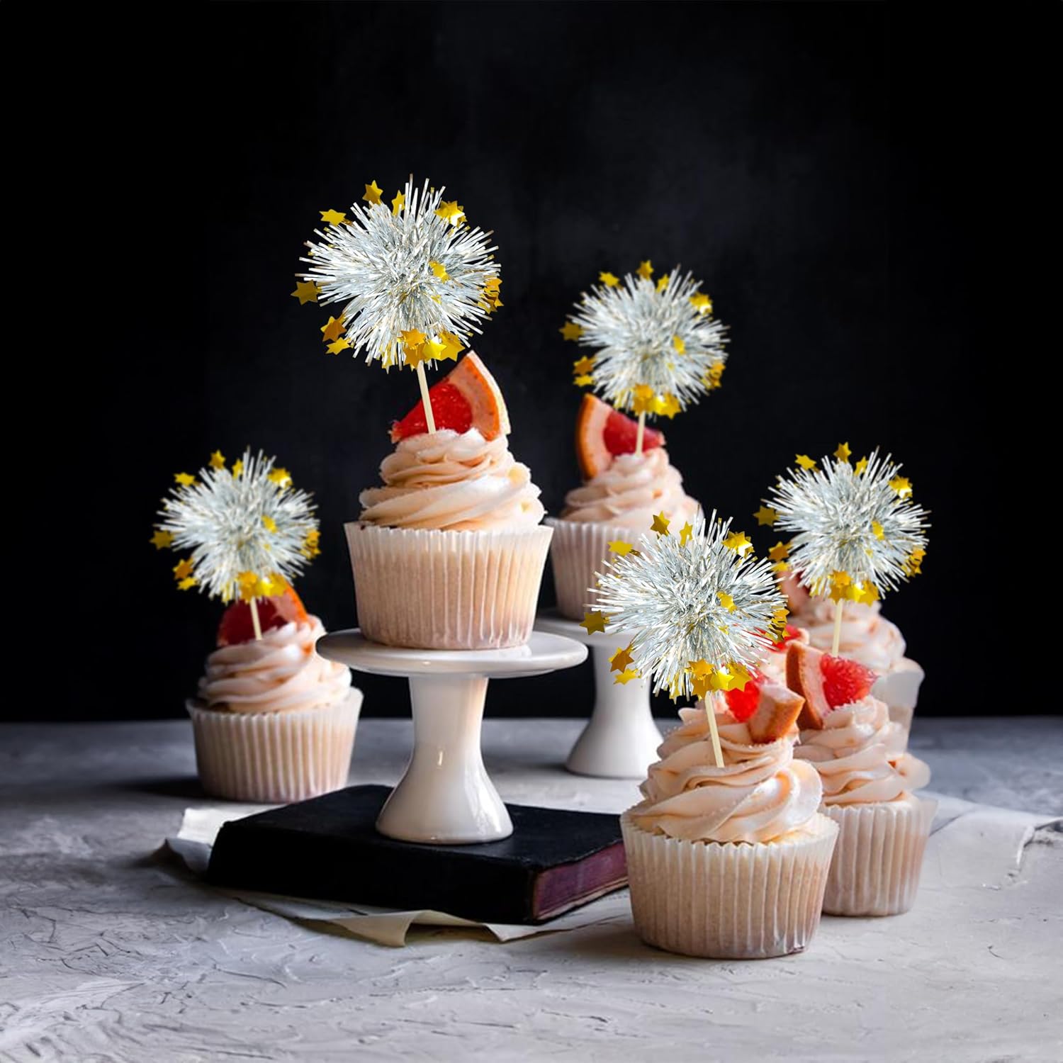 Ephlyn 30Pcs Foil Firework Cupcake Toppers Sparkle Tinsel Cupcake Picks Happy Birthday Cake Decorations Drink Stirrers Cocktail Food Fruit Toothpicks for Baby Shower Graduation Party Supplies Silver