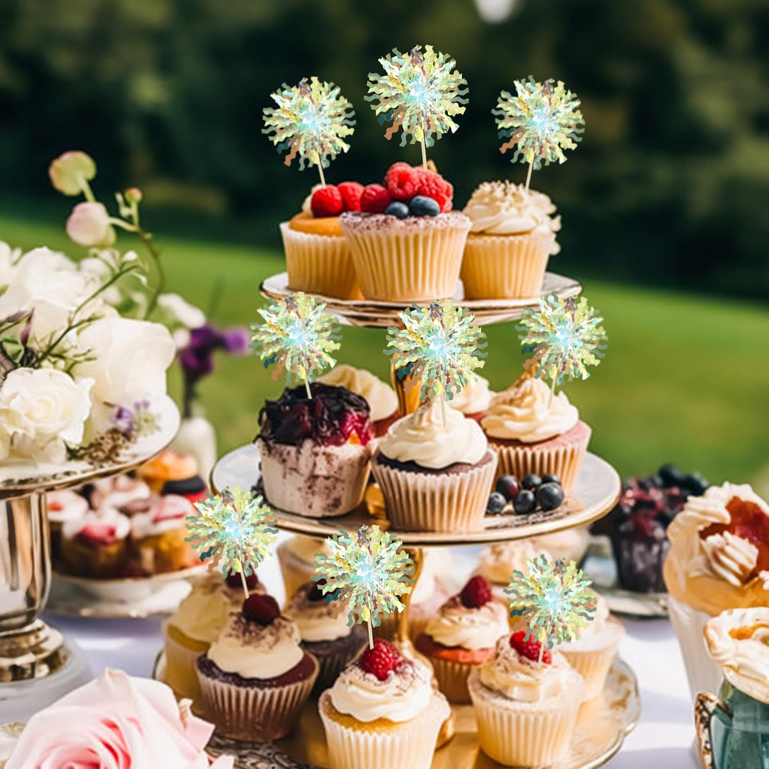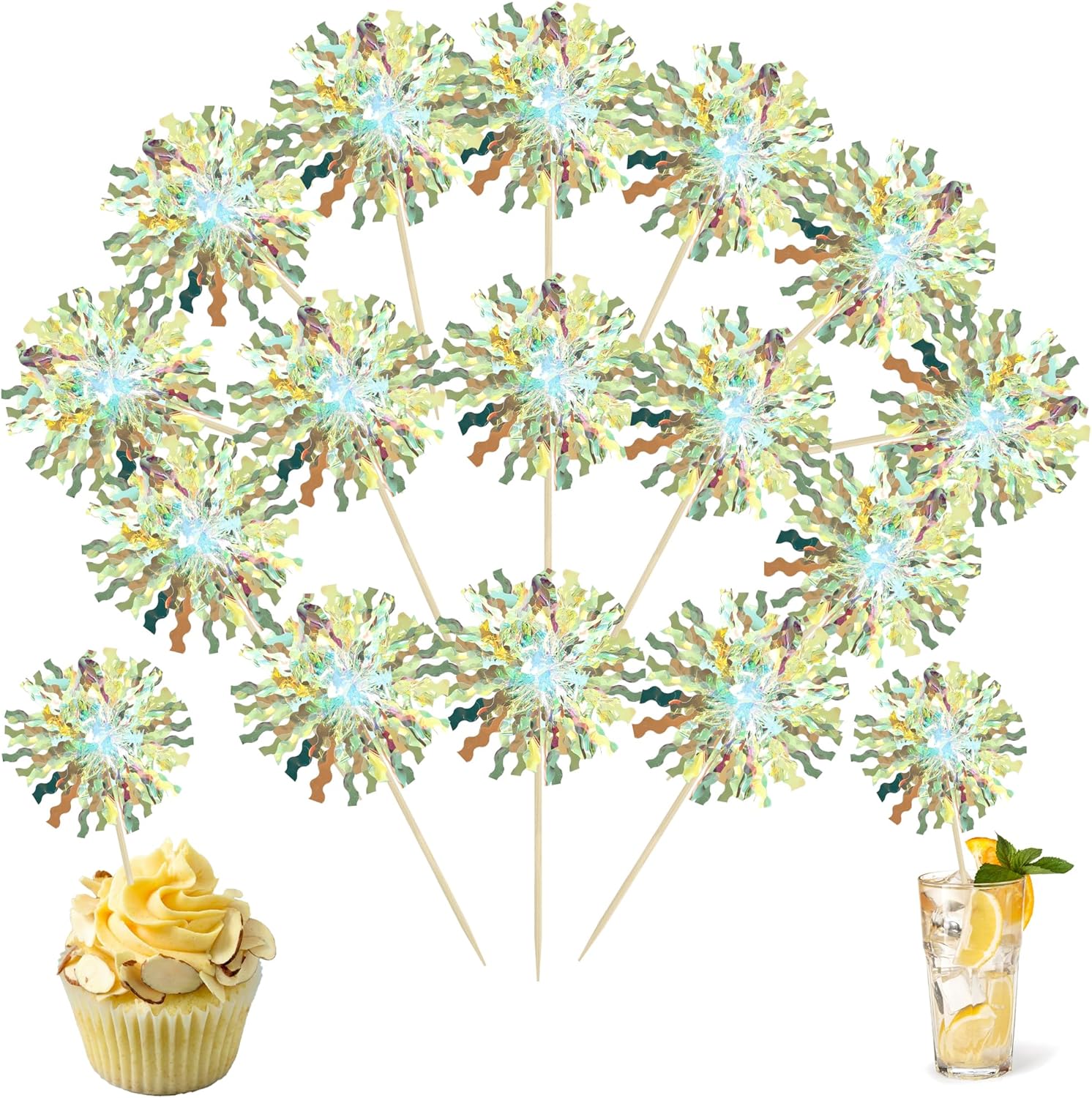 Ephlyn 30Pcs Foil Firework Cupcake Toppers Sparkle Tinsel Cupcake Picks Firework Cake Decorations Cocktail Food Fruit Toothpicks for Baby Shower Graduation Party Supplies White