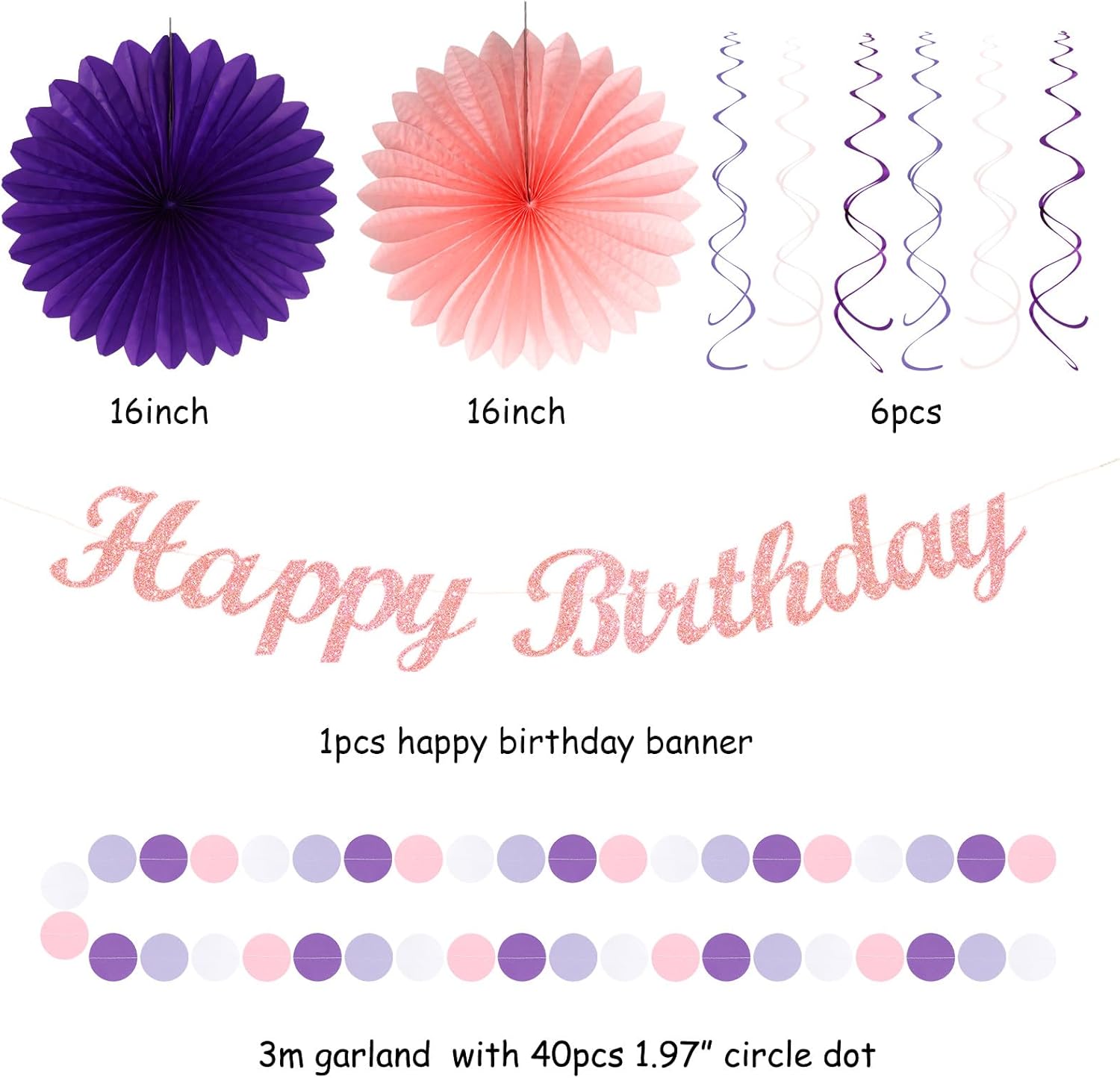 • 【Pink Light Purple Lavender Party Kits】This kits include 1pcs happy birthday banner, 1pcs circle dots paper banner, 4pcs tissue pom poms: 3pcs 10" and 1pcs 12" , 3pcs 8inch paper honeycom ball, 2pcs 8inch paper lantern, 4pcs 12inch paper flower fan, 6pcs Paper swirls hanging streamers.
