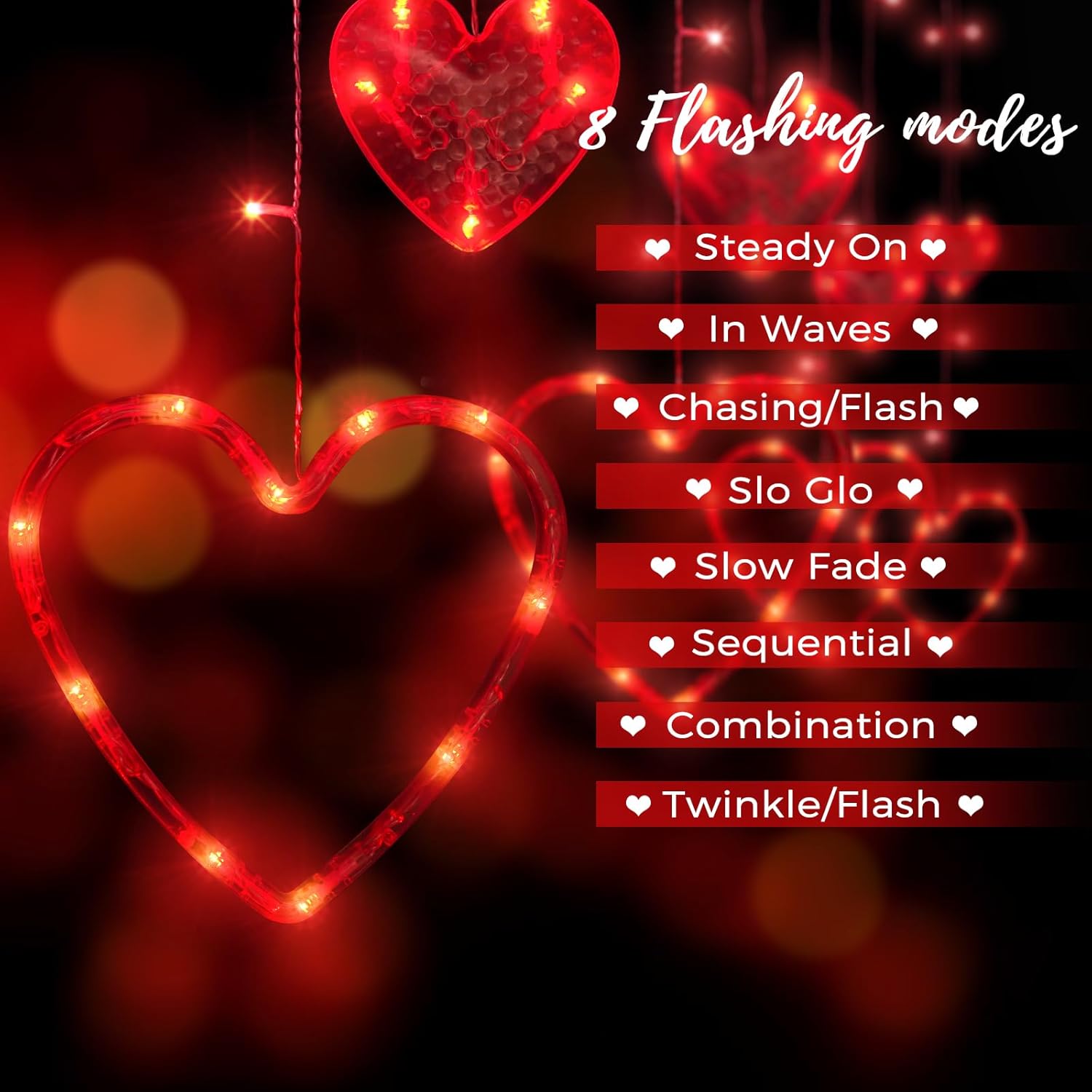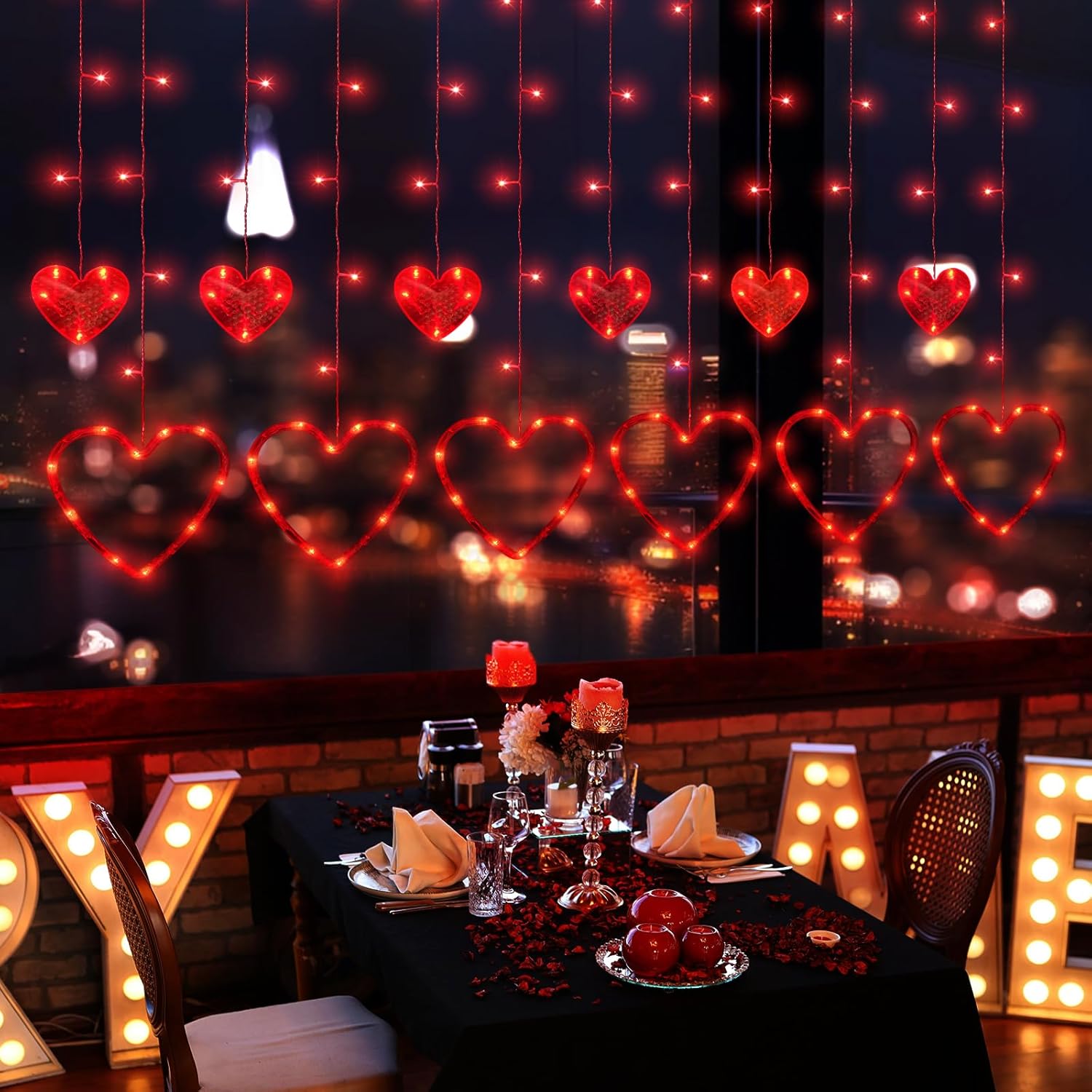 • Valentines Day Window Curtain Lights : Love heart window curtain lights with 138 Led, 12 Love Heart ornaments, 6 big and 6 small heart lights, exudesing a soft and charming light, creating a romantic evening atmosphere for you