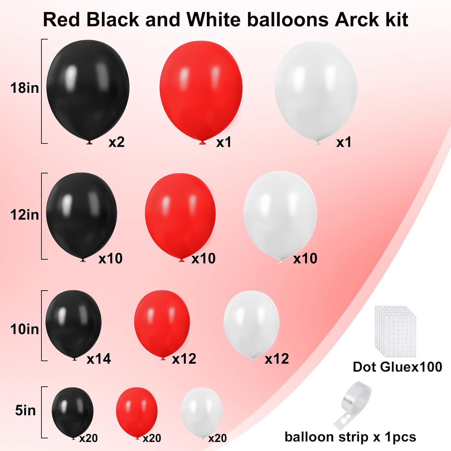 • 【Red Black and White Balloon Garland Arch Kit】These red and black balloons includes 132pcs different sizes of black balloons(18in*2, 12in*10, 10in*14, 5in*20), white balloons(18in*1, 12in*10, 10in*12, 5in*20), red balloons(18in*1, 12in*10, 10in*12, 5in*20), a roll of 16ft garland strip and glue dots. Perfect size and quantity of black and silver balloons to create best atmosphere in your party!
