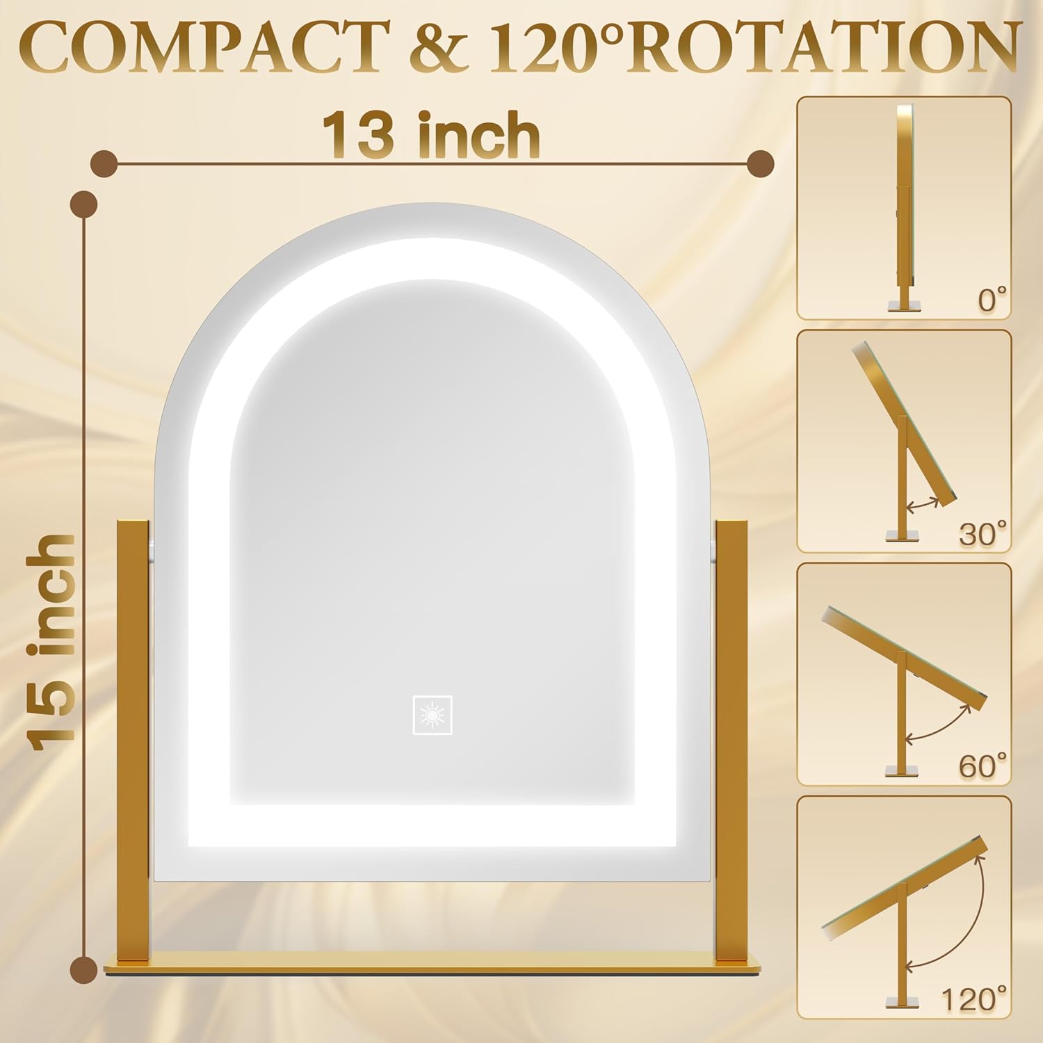 Lighted Makeup Mirror with 3-Color Dimmable Lighting, with Removable 10x Magnifier, Smart Touch Control, 360° Rotation, 15" x 13" Hollywood Vanity Mirror for Tabletop Desk (Gold)