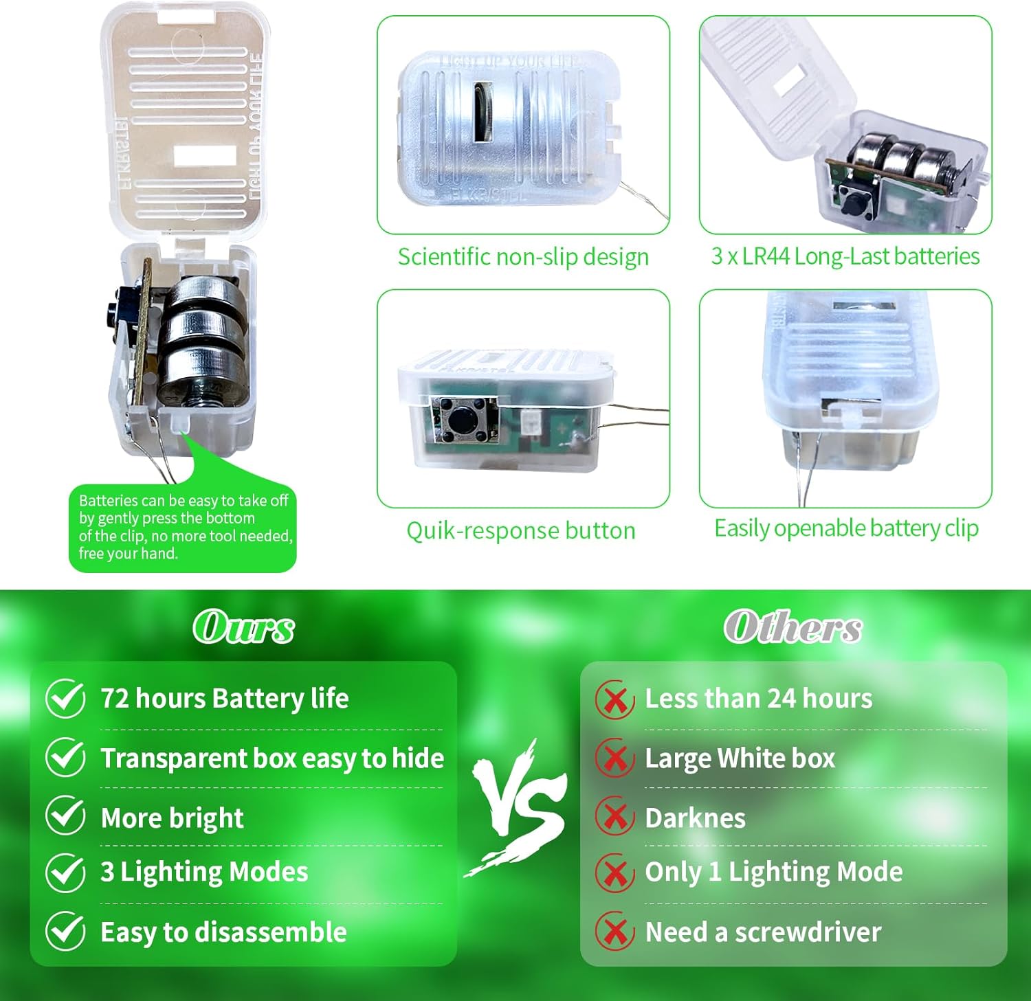 • UPGRADED DESIGH AND EASY TO REPLACE: The fairy lights' newest clear and small battery box is 0.78*1.29 inches in size, very easy to hide into all your DIY projects. The upgraded battery pack has scientific non-slip design on both sides, which makes it feel comfortable and easy to catch. Batteries are also very easy to take off, no more screwdriver needed, just gently press the bottom of the clip to open, free your hand