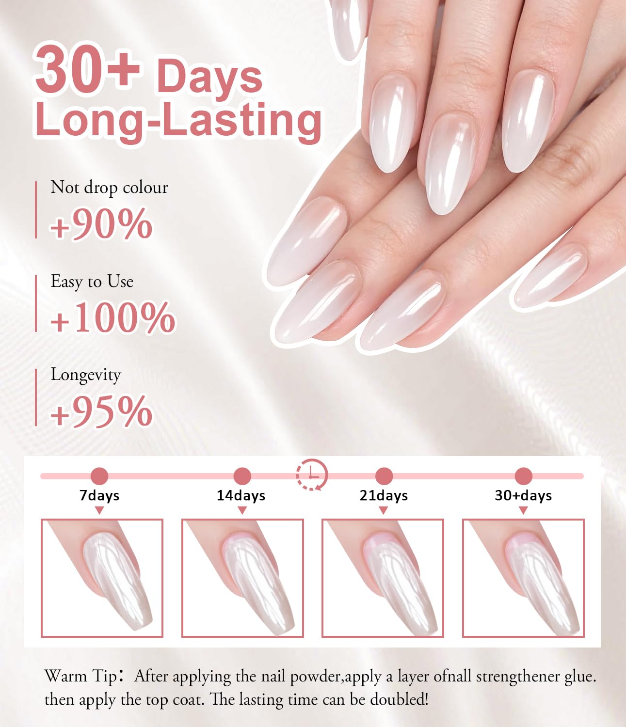 • Super Sheer Pearl Nail Powder: BISHENGYF white chrome nail powder is an ideal choose for achieving a stunning ice transparent and glossy glazed donut nail effect. This white powder has a translucent water-like sheen that gives your nails a radiant glow from within, adding dimension. If you're looking for a transparent powder, this powder definitely for you.