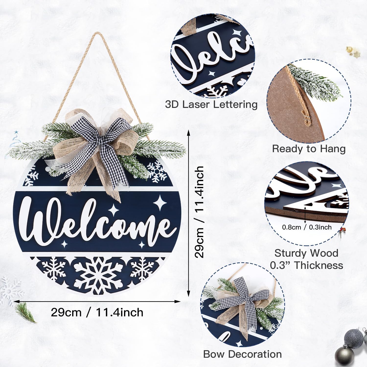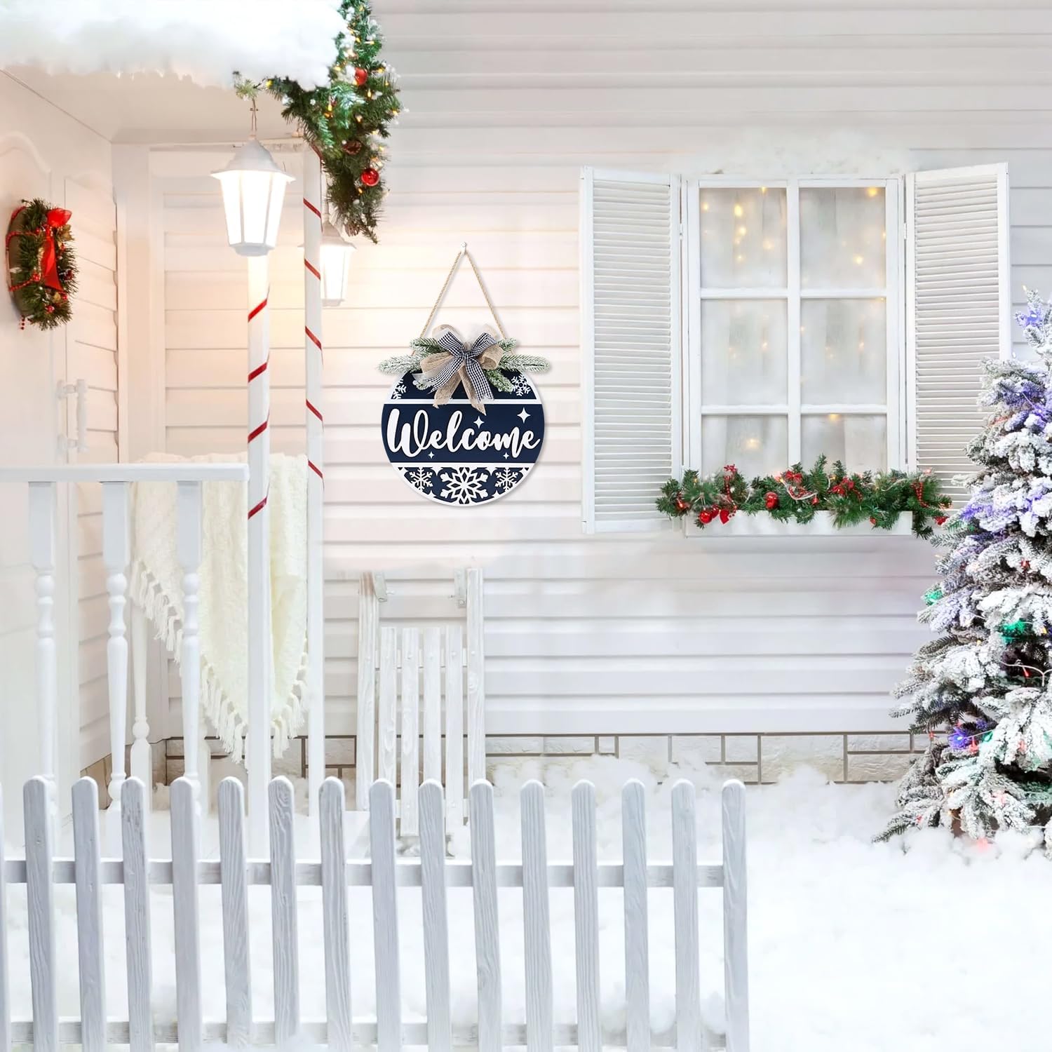 CHDITB Blue Welcome Winter Front Door Sign Wreath(11.4”), Wooden 3D Welcome Home Decoration Wall Hanging with Plaid Bow Snowflake, Farmhouse Christmas New Year Decor for Home Office