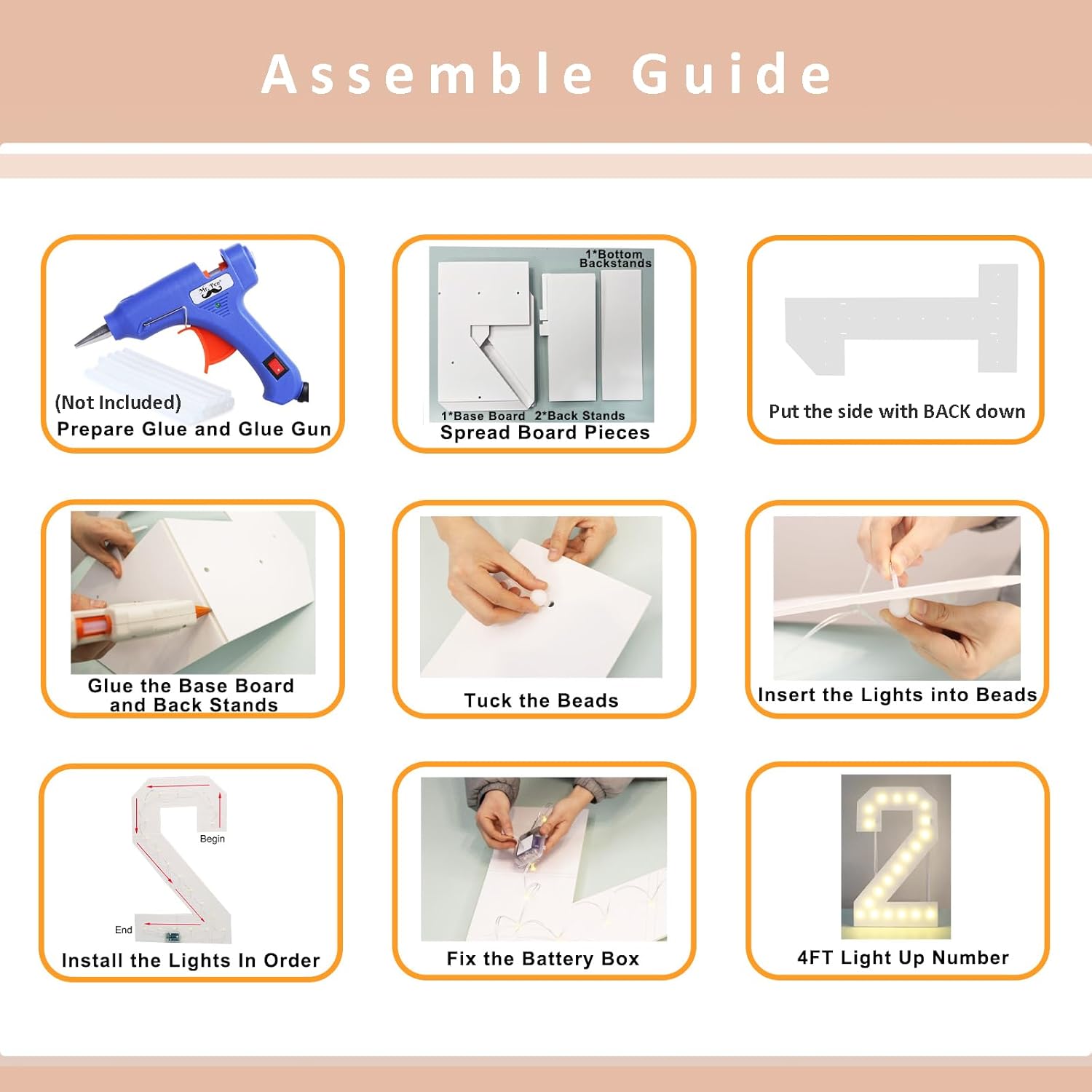 • Need to Assemble: You only need to prepare hot glue gun and glue. Pre-cut mosaic number design making assembly more easier and faster. Just glue the base board and assemble the led string lights. Decorate your party with your child or friends and have fun